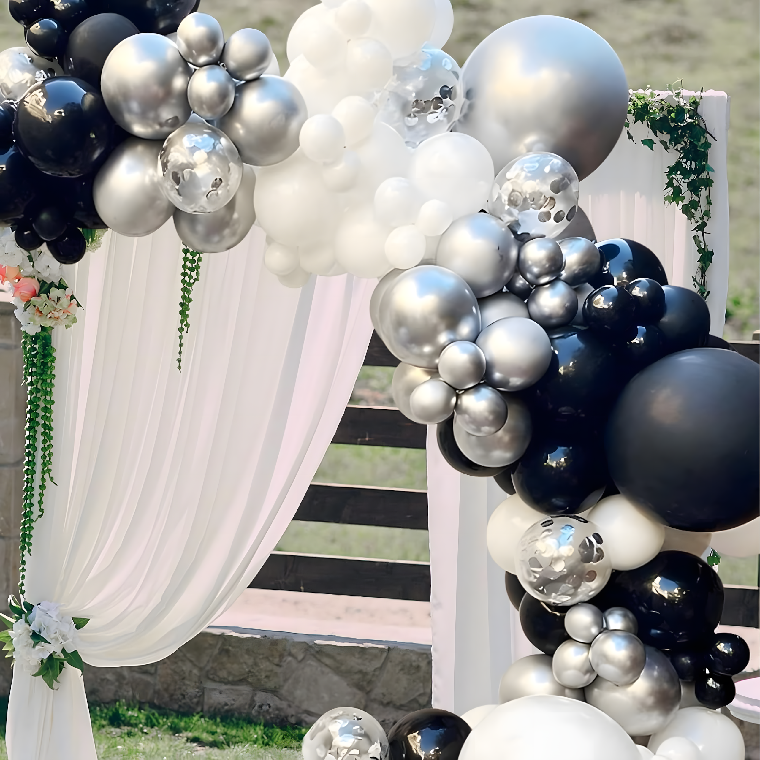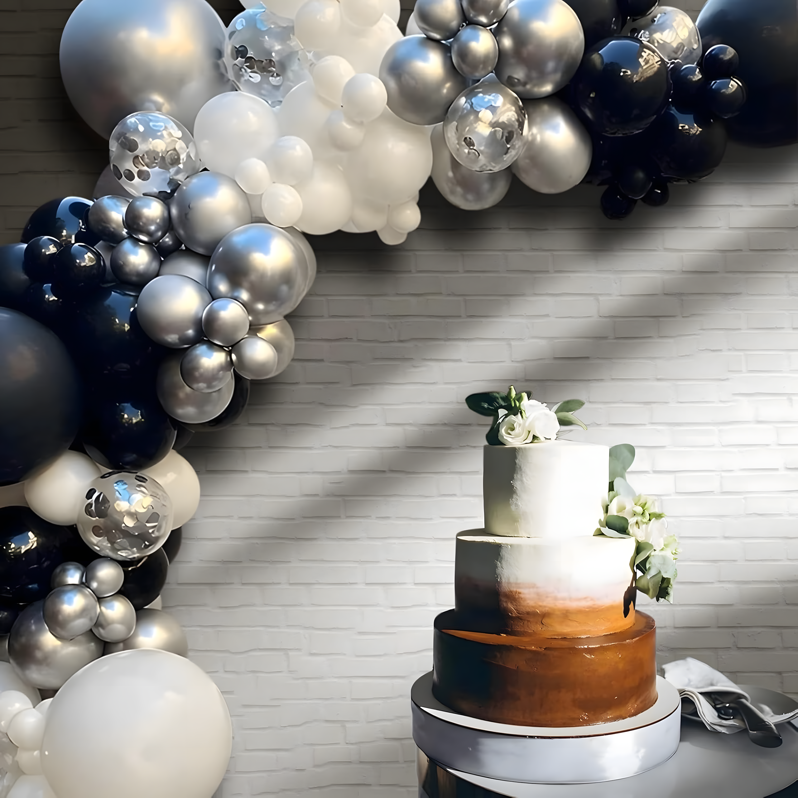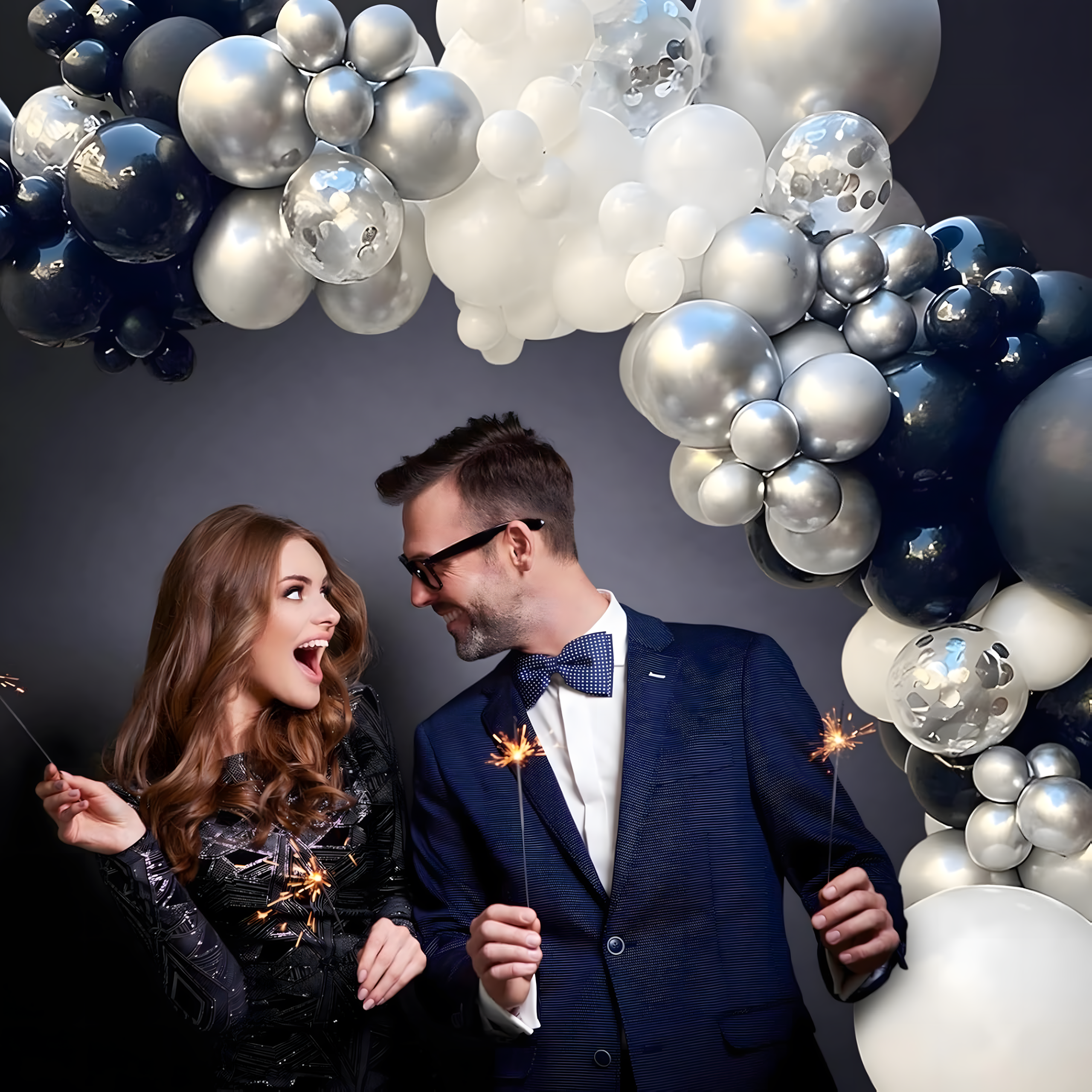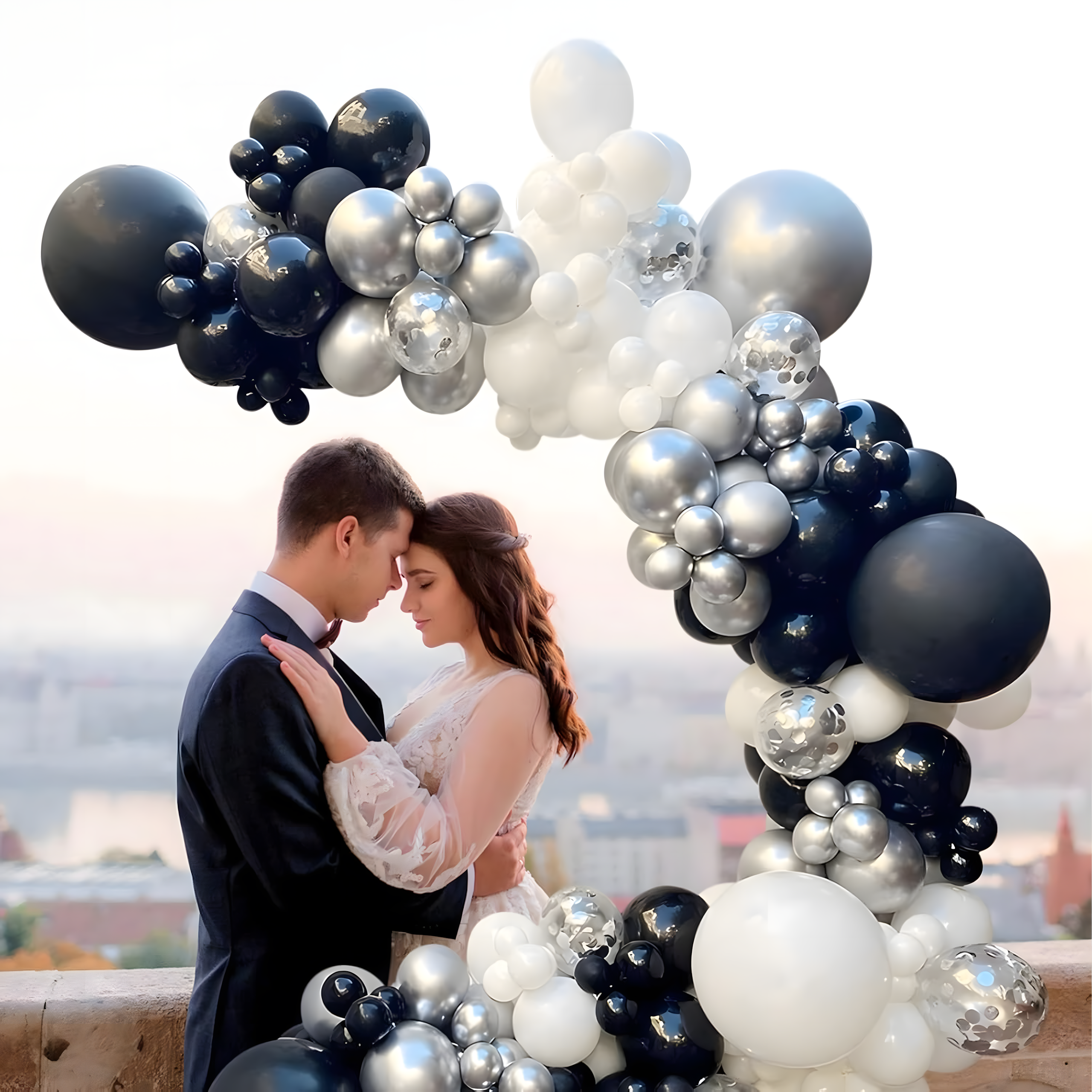 Girlanda balonowa czarno-srebrno-biała 107 elementów – elegancki zestaw dekoracyjny idealny na urodziny, wesela, sylwestra i eventy. Łatwy montaż, efektowne kolory i idealne tło do zdjęć!