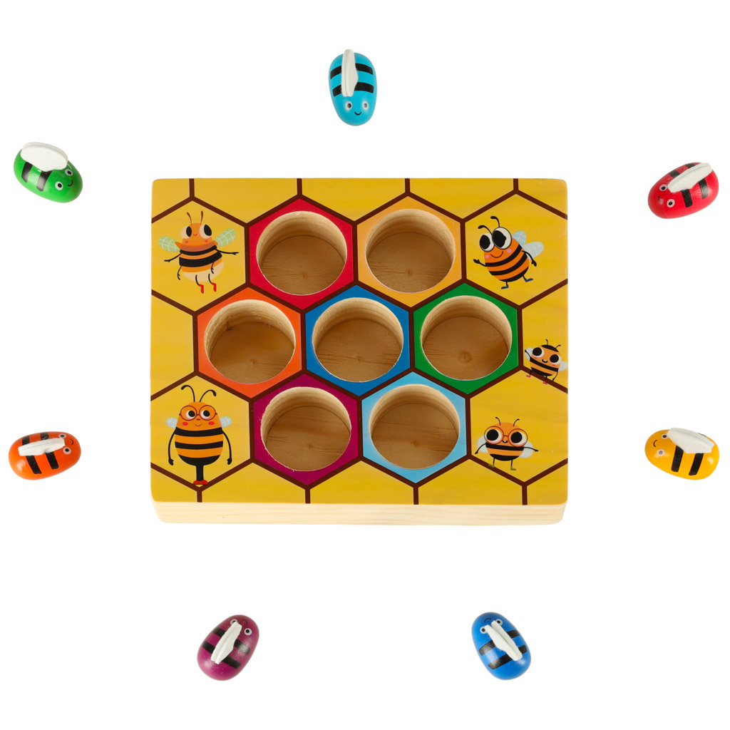 Drewniana, edukacyjna gra ozdobiona obrazkiem. Zabawa polega na włożeniu w otwory 7 pszczół w odpowiednim kolorze za pomocą pęsety. Zabawa pobudzi zmysł logicznego myślenia, nauczy cierpliwości i wspomoże naukę nazw kolorów. Wymiary: 16,5×13,5×3,5cm.
