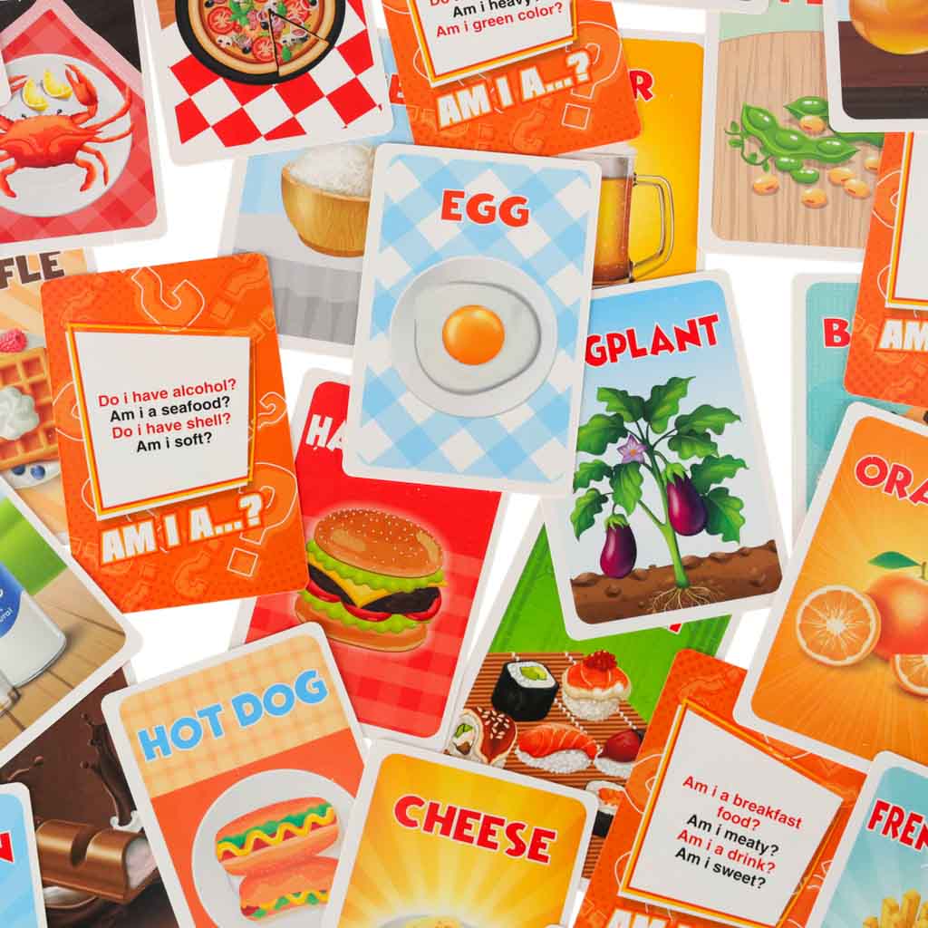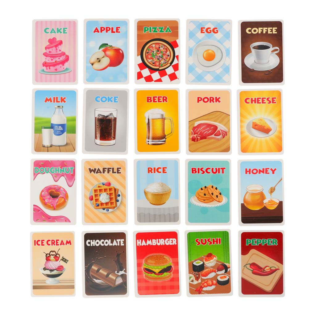 zawiera 54 kart, które mają różnorodne obrazki jedzenia i podpisy po