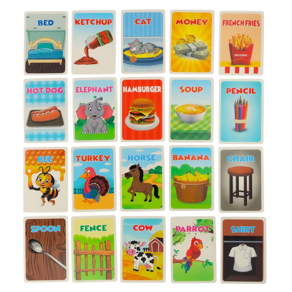 zawiera 42 karty, które mają różnorodne obrazki i podpisy po angielsku.