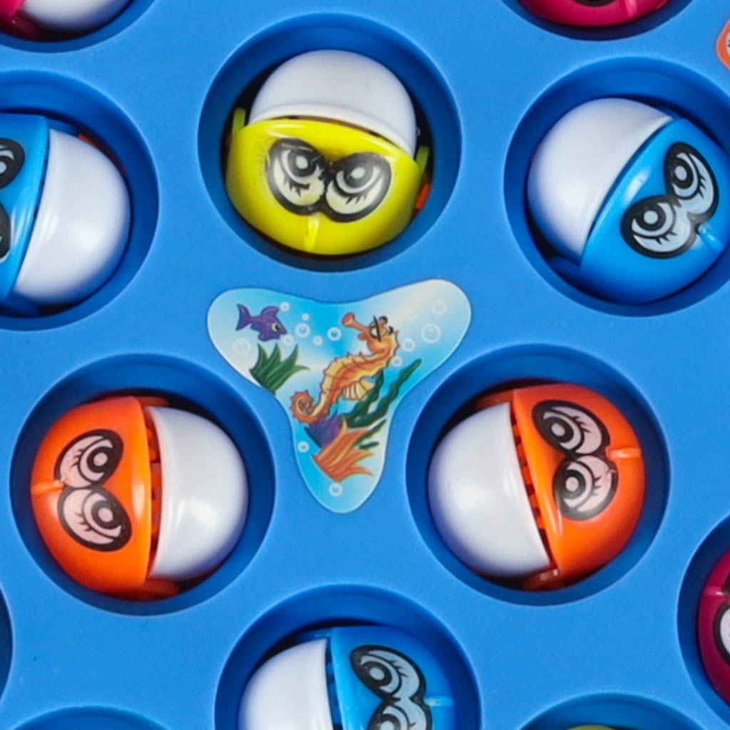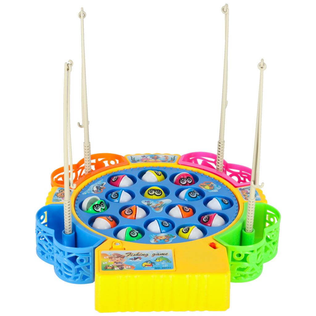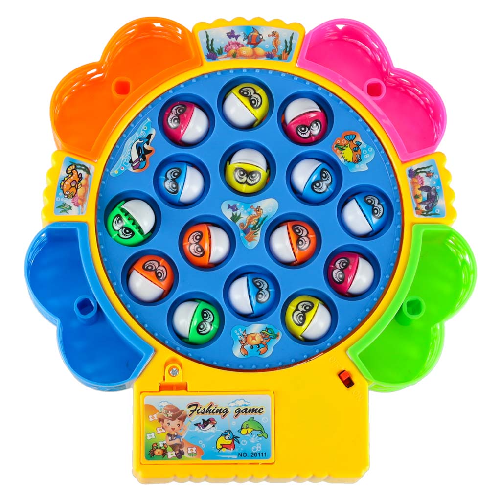 Rodzinna gra łowienie rybek. W zestawie: podstawka, 15 rybek i 4 wędki. Zasilanie: 2 baterie AA 1,5V (brak w zestawie). Wymiary podstawy: 21x20x3,5cm.