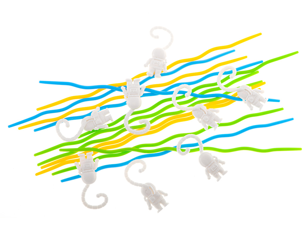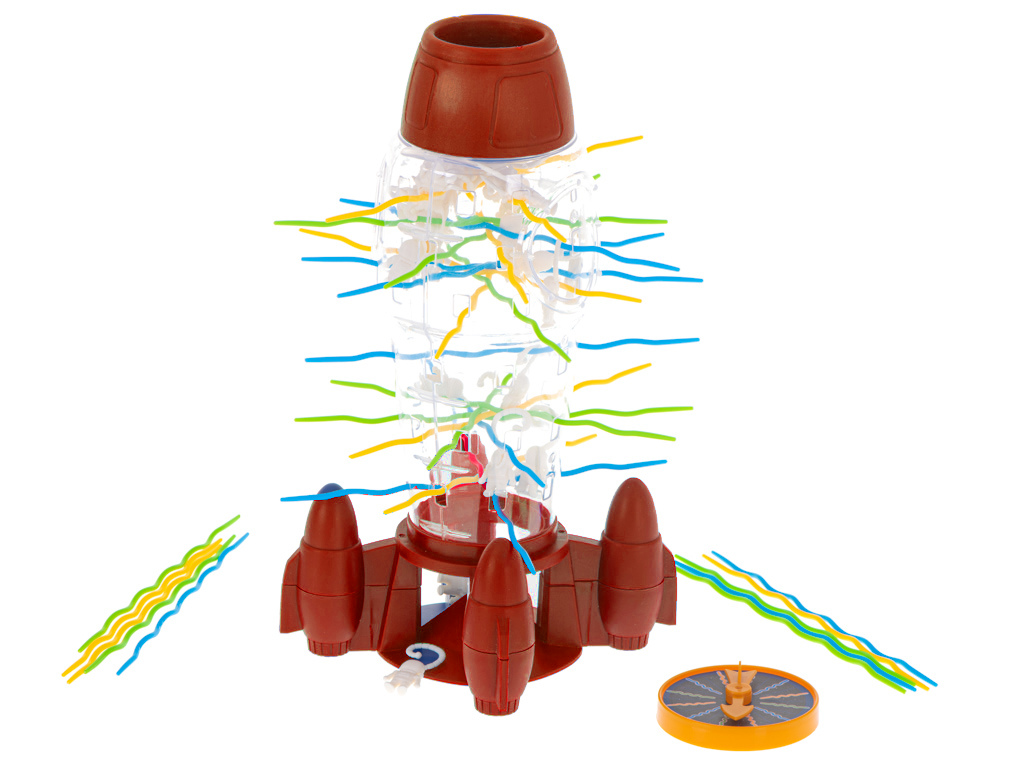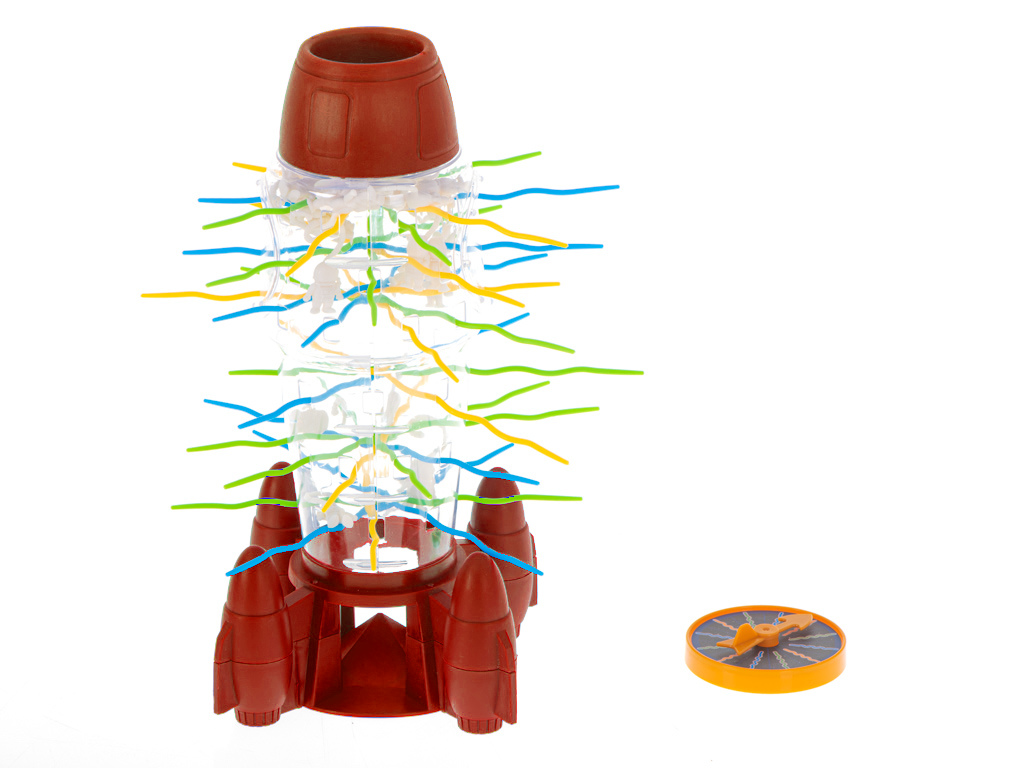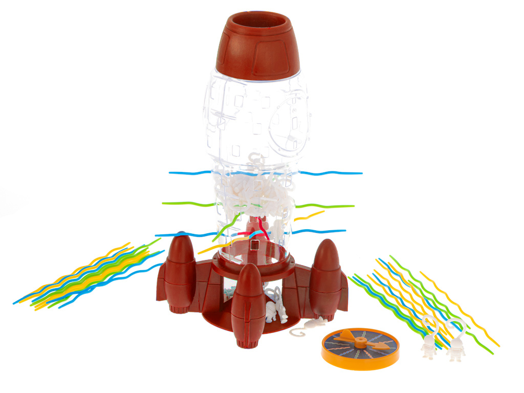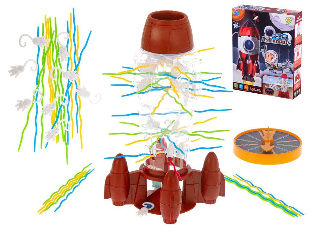 Gra zręcznościowa w bierki w nowym kosmicznym wydaniu. Celem gry jest wyjęcie wszystkich patyczków, tak aby z rakiety spadło jak najmniej astronautów. Tworzywo: plastik. Wymiary: rakiety – 12,5cm x 12,5cm x 28cm, kosmonauty – 2cm x 4cm, patyczka – 17cm.