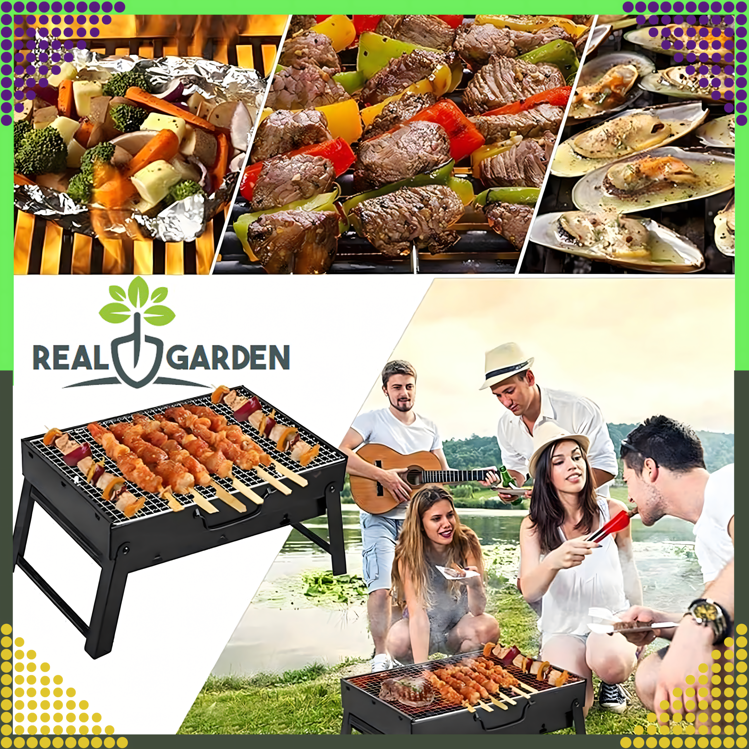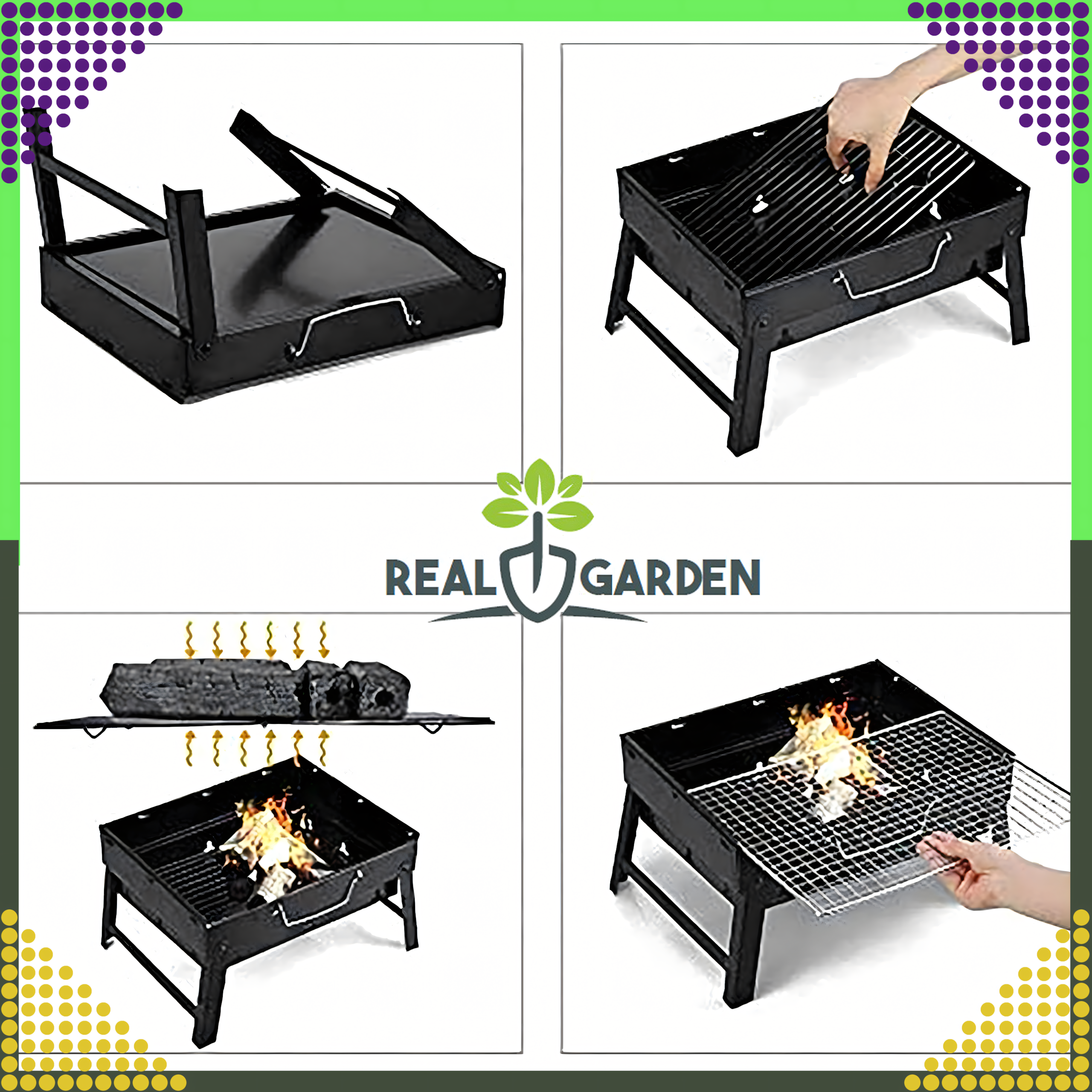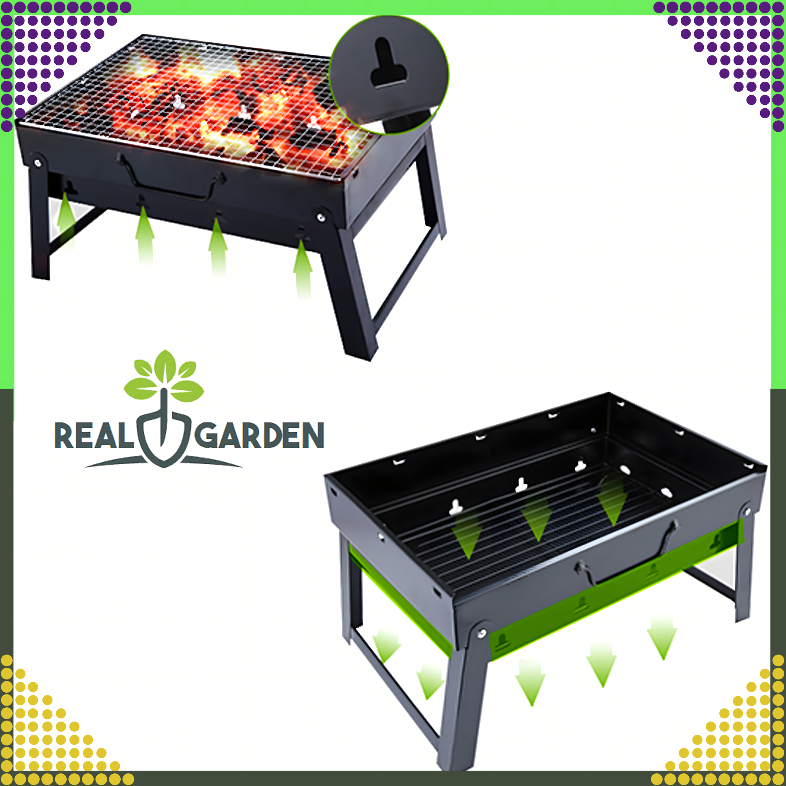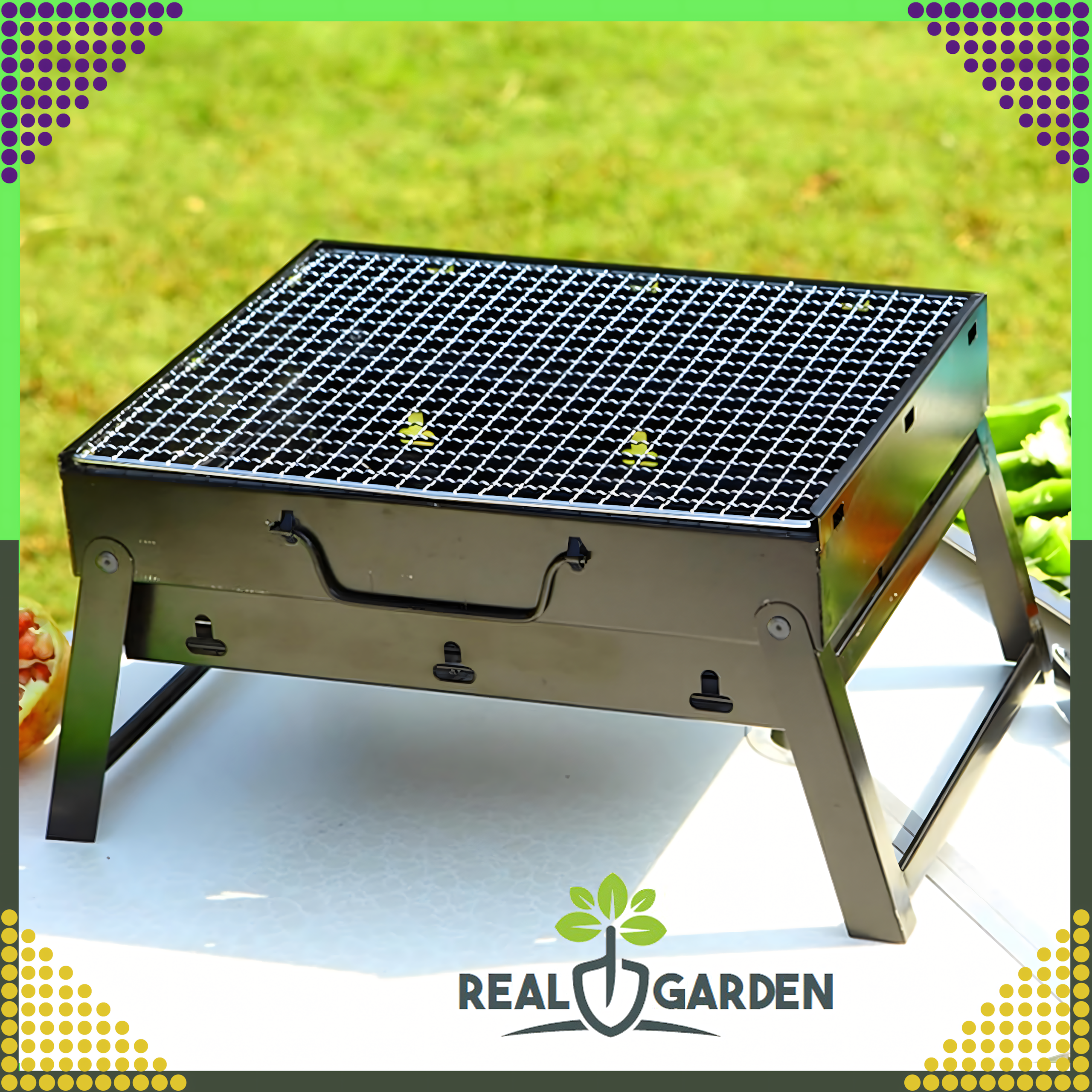 Składany grill ogrodowy wykonany ze stali nierdzewnej malowany na czarny kolor. Wyposażony w dolny ruszt na węgiel oraz uchwyty po bokach ułatwiające przenoszenie.
