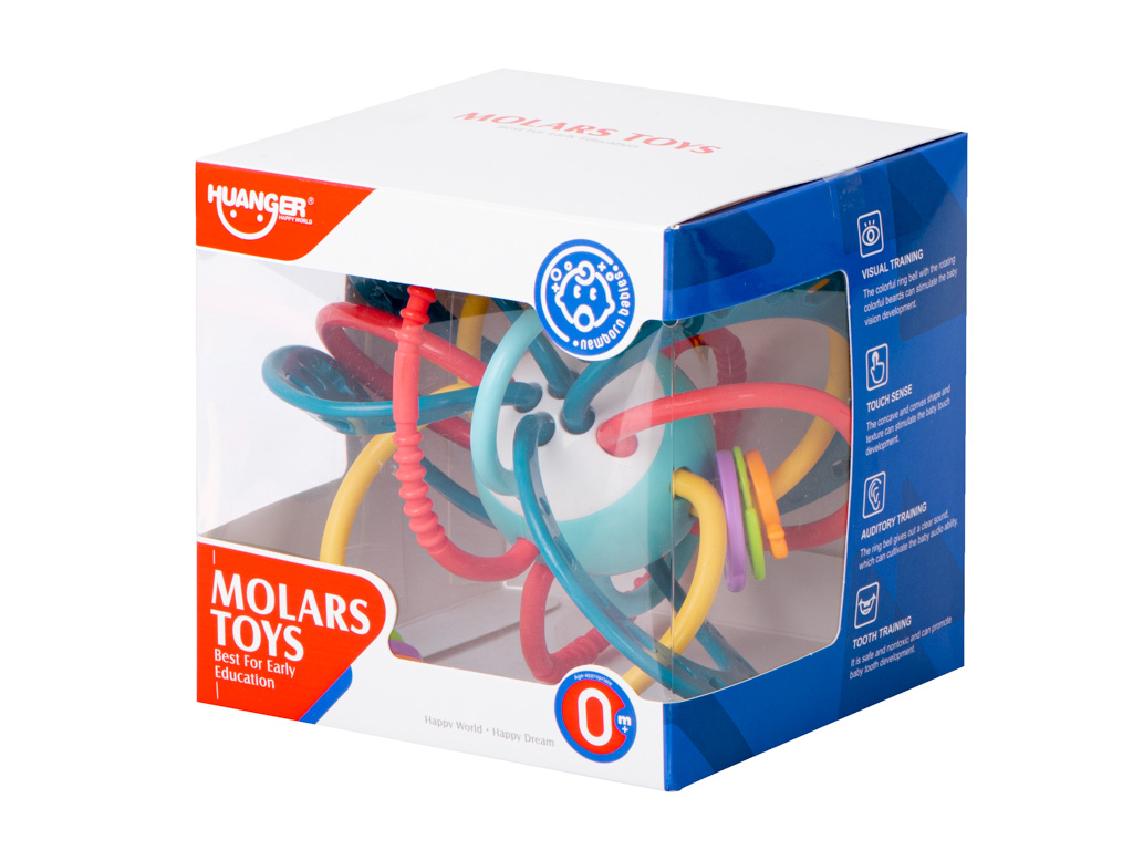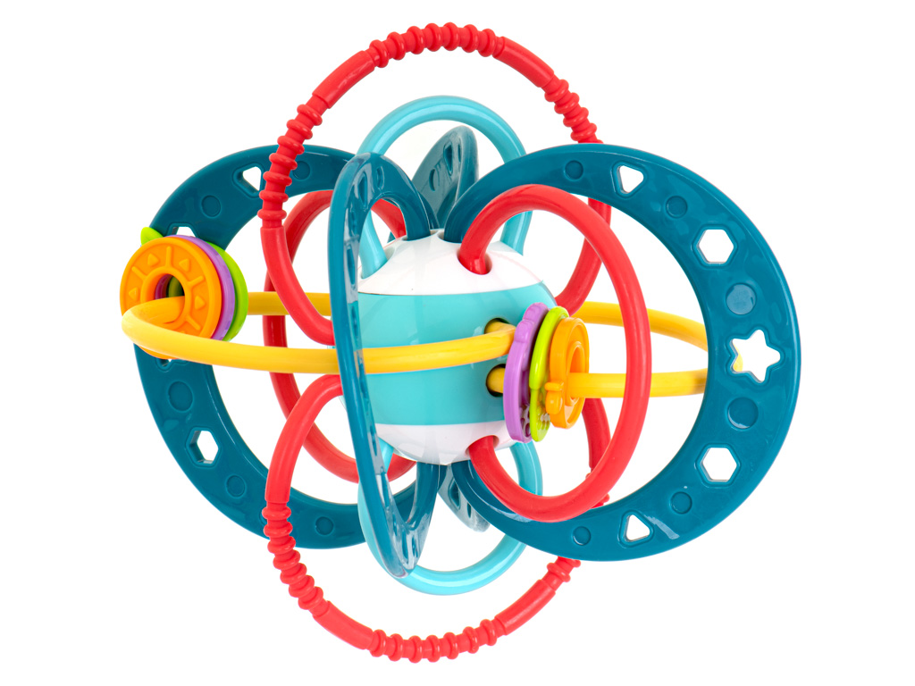 Kolorowy gryzak grzechotka dla dzieci. Przynosi ulgę podczas ząbkowania. Rozwija zmysł słuchu, wzroku i dotyku. Wykonany z bezpiecznego tworzywa i pozbawiony ostrych krawędzi. Wymiary: 15cm x 14cm.