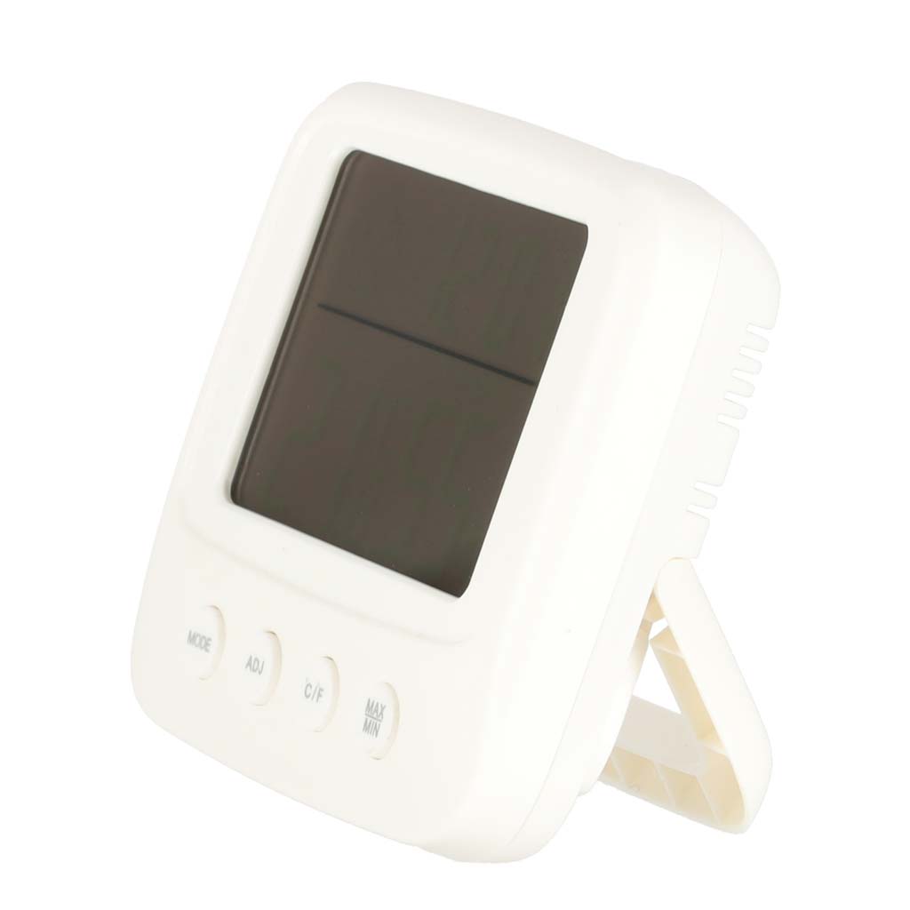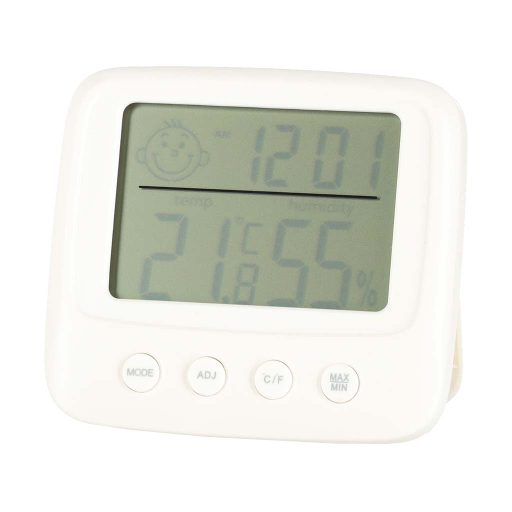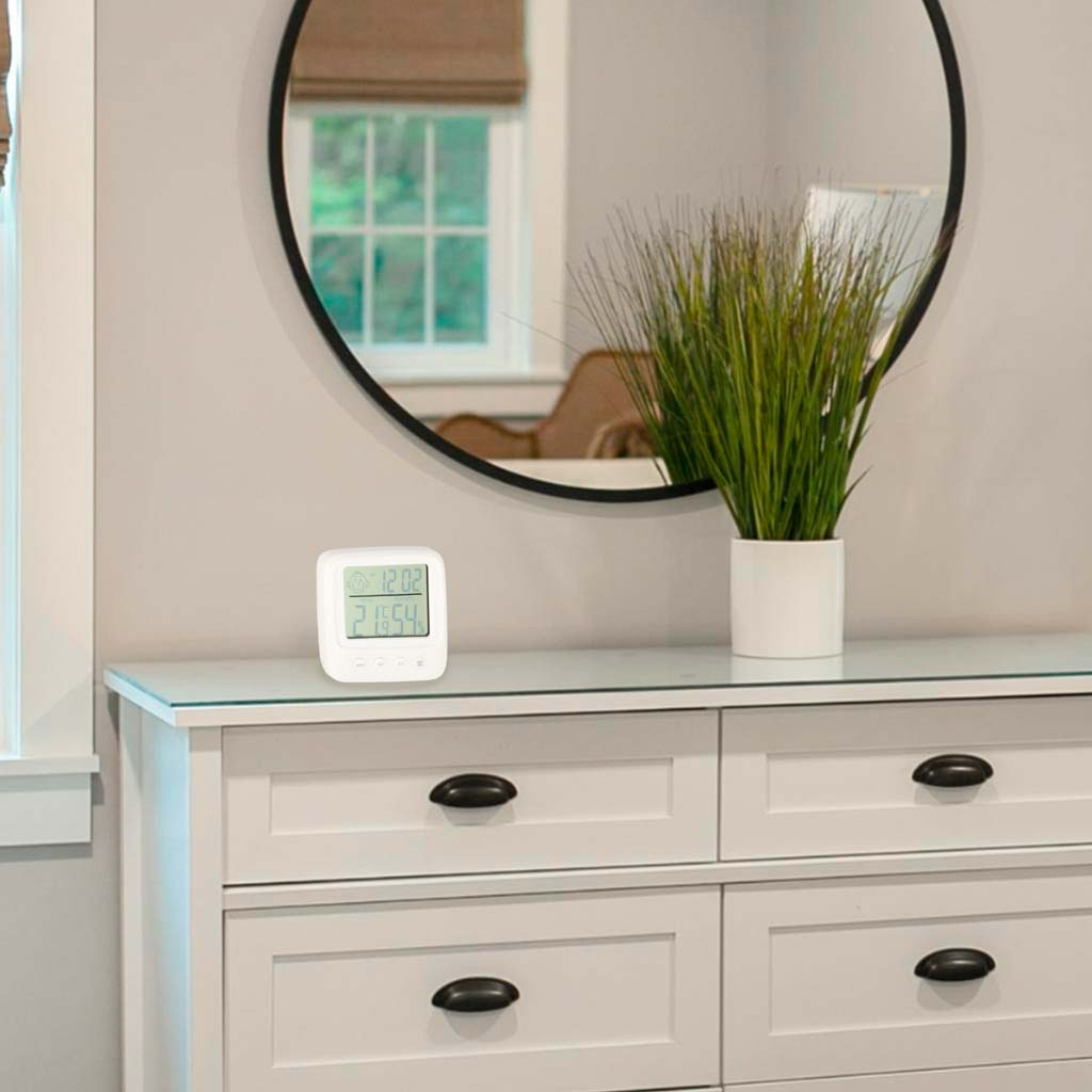 Domowy higrometr z dodatkowymi funkcjami – zegar z budzikiem, termometr. Posiada podpórkę, dzięki czemu można go wygodnie postawić w każdym dowolnym miejscu. Zasilanie: 2 baterie AAA. Wymiary: 8,5 cm x 7,8 cm x 2,8 cm.