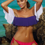 Bardzo seksowny, jednoczęściowy kostium kąpielowy typu monokini z brazylijskim tyłem. Gładki, z małą, złotą, biżuteryjną kokardką przy dekolcie i fikuśną falbaną w najmodniejszym obecnie, kubańskim stylu. Kobiecy, finezyjny, zmysłowy… Powitaj jeden z najgorętszych modeli tego sezonu! Miseczki z fiszbinami, usztywniane, z umieszczonym w nich na stałe, niewyjmowanym wypełnieniem push up – świetnie modelują piersi, unoszą je i optycznie powiększają. Ramiączka całkowicie odpinane, świetne do równomiernego opalania dekoltu i ramion. Obwód zapinany na klamerkę. Dolna część kostiumu jest wygodnie wiązana po bokach. Tył o kroju lekko odsłaniającym pośladki (typ brazylijski). Gdy zechcesz możesz założyć do niego pareo i komfortowo przejść się po plaży. Model uszyty z włoskiej, elastycznej tkaniny. Najnowsza kolekcja Lato 2018.