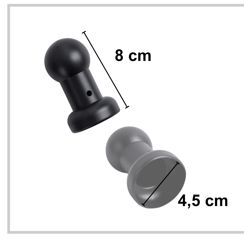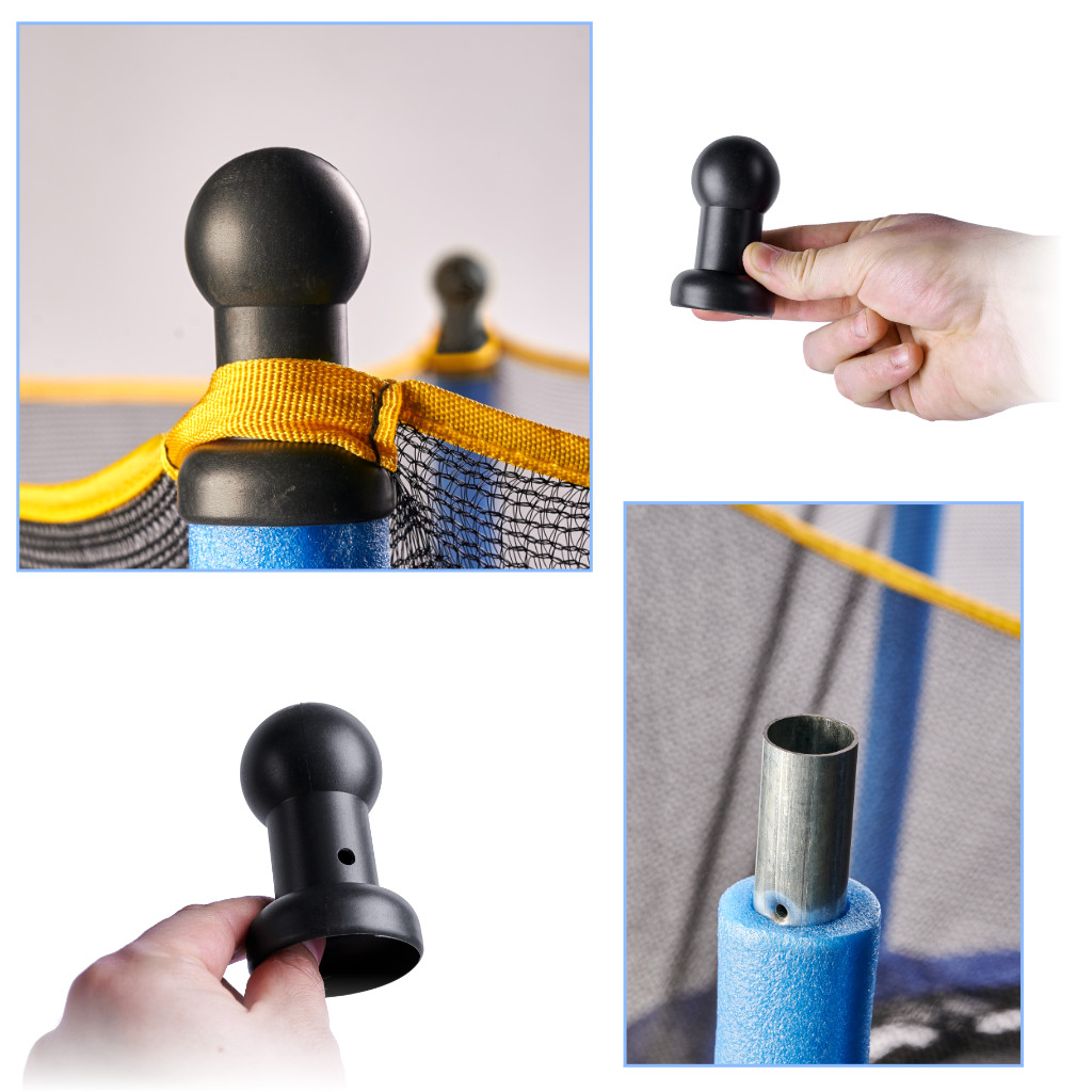 Zestaw sześciu kapturków na słupki trampoliny. Wykonane z plastiku w czarnym kolorze. Montaż poprzez nałożenie na słupek i przykręcenie. Średnica wewnętrzna: 2,5 cm. Wymiary kapturka: 8,5 cm x 4,8 cm.