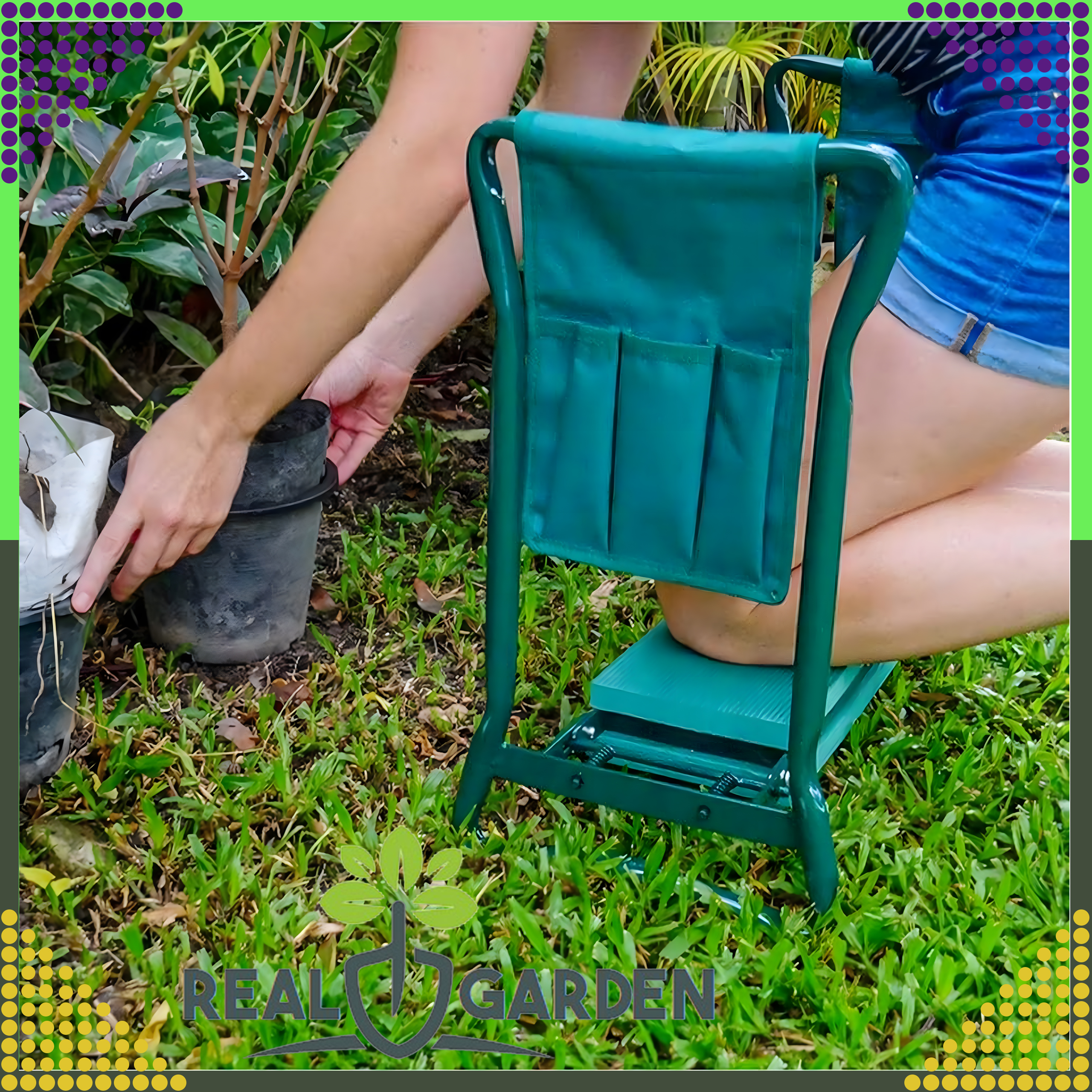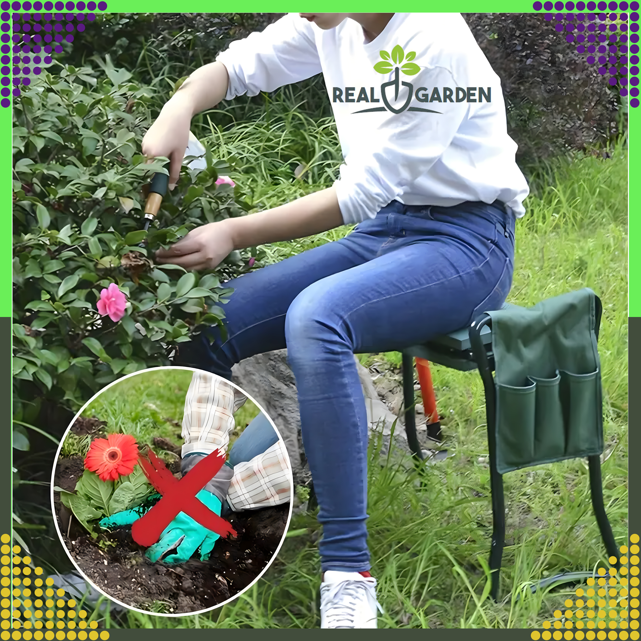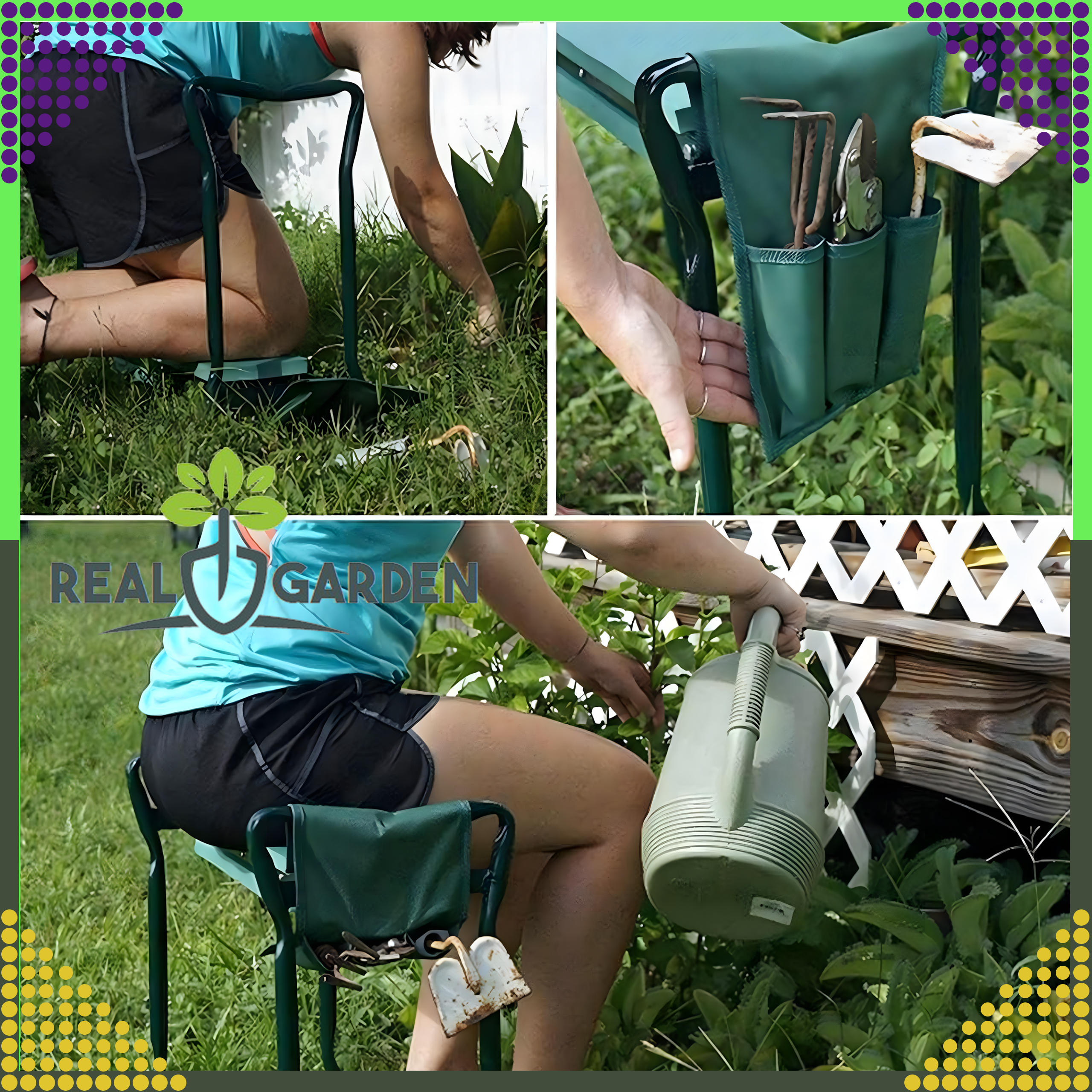 Ponadto zawiera w bocznej części 2 torby z trzema przegrodami, do której można włożyć niezbędne narzędzia ręczne. Taboret ułatwi wykonanie prac takich jak: sadzenie, siew, pielenie, pikowanie czy też zbiór owoców i warzyw.