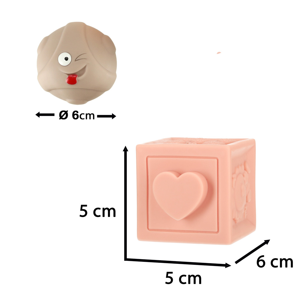 Piłeczki i klocki sensoryczne wykonane z miękkiego silikonu. Zestaw zapewni wszechstronną zabawę pełną rozrywki, nauki i rozwoju. Na klockach znajdują się różne wzory oraz liczby. Wiek: 6m+. Klocek: 5 cm x 5 cm x 6 cm. Kulka: 6 cm.