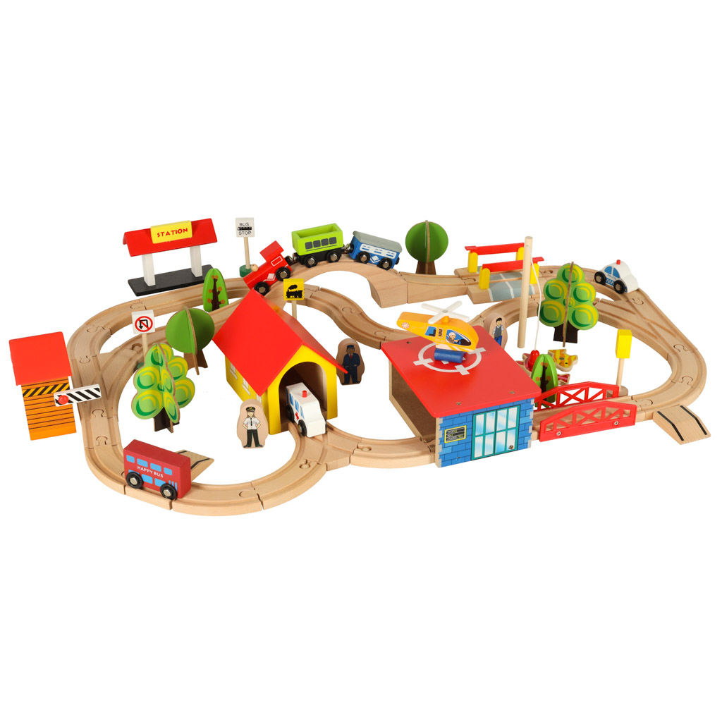 torów, w zestawie znajdują się również pociąg z wagonami, samochody, budynki,