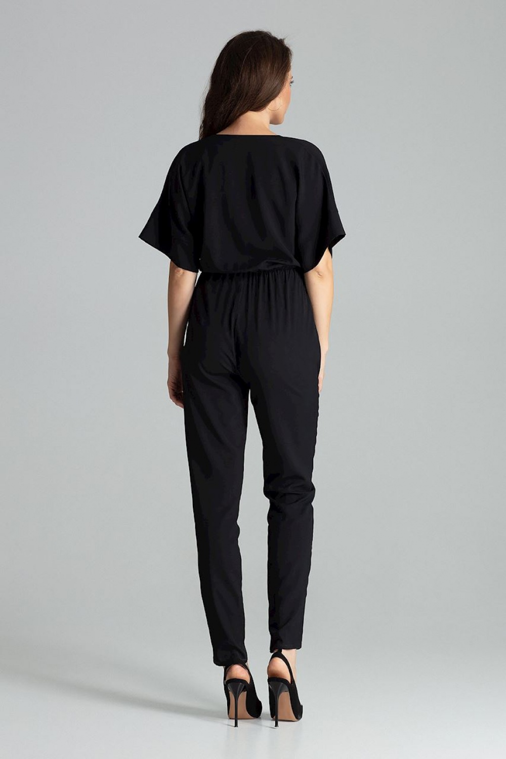 Czarny kombinezon z długimi prostymi spodniami i krótkim, kimonowym rękawem zakończonym mankietem. W pasie odcięty, wszyta gumka. Kopertowy dekolt. Kombinezon bez kieszeni.