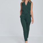 Zielony kombinezon w serek z kołnierzem, bez rękawów, wiązany w pasie, luźne nogawki zwężane do dołu. Zapinany z przodu w pasie na jeden zatrzask zewnętrzny i wewnętrzny oraz kryty zamek. Kieszenie w bocznych szwach.