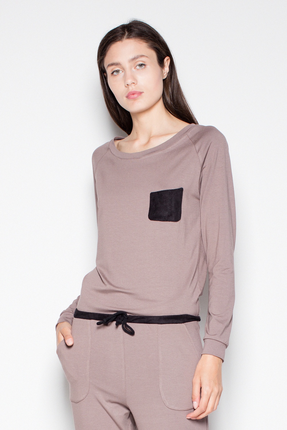 Szykowny kombinezon z długim rękawem oraz długimi nogawkami. Charakteryzuje się kieszonką i paskiem w kontrastującym kolorze. Bardzo wygodny a zarazem niezwykle elegancki.