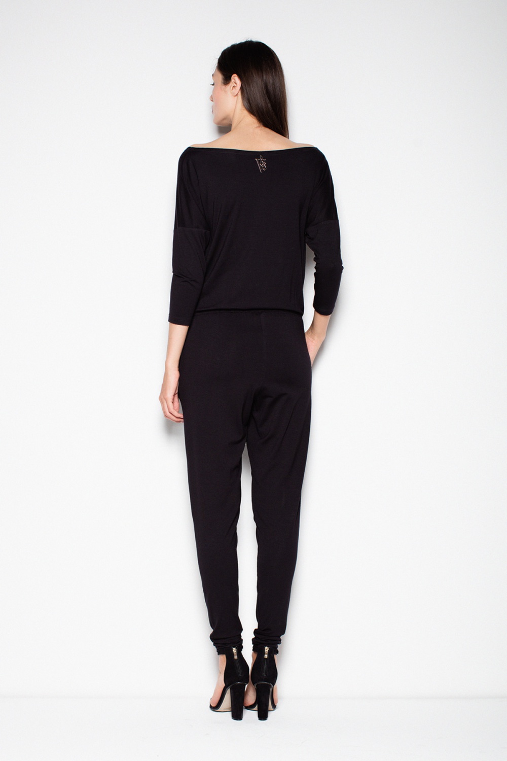 Sportowy kombinezon z półokrągłym dekoltem i opadającymi rękawami, odcinany w pasie. Klasyczny krój.