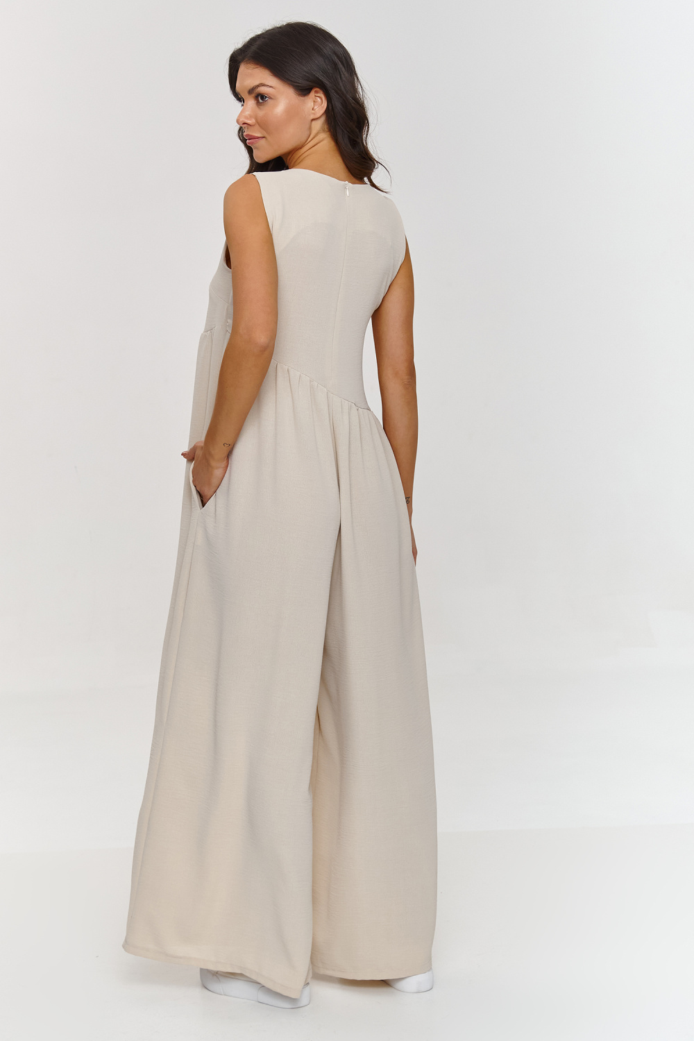 Ten kombinezon maxi to idealny wybór dla kobiet, które szukają wygodnego, a zarazem stylowego rozwiązania na ciepłe dni. Ma luźny krój, który zapewnia maximum wygody oraz na wysokości tali ukośne przeszycie tworzące delikatne fałdy. Szerokie nogawki dodają całości lekkości i elegancji, tworząc idealną opcję na codzienne stylizacje lub letnie wyjścia. Model wyposażony jest w kieszenie, co dodaje mu funkcjonalności i praktyczności. Kieszenie stanowią świetne rozwiązanie, gdy chcesz mieć pod ręką najpotrzebniejsze drobiazgi, nie rezygnując z eleganckiego wyglądu. Wykonany z przewiewnego materiału, który jest nie tylko przyjemny w dotyku, ale także praktyczny i przewiewny. Kombinezon posiada okrągły dekolt, który zapewnia wygodę i stylowy wygląd. Nasz kombinezon maxi z szerokimi nogawkami to doskonała opcja na każdą okazję, kiedy zależy Ci na modnym, ale zarazem wygodnym rozwiązaniu. Dzięki luźnemu krojowi, funkcjonalnym kieszeniom i lekkiemu materiałowi, kombinezon stanie się Twoim ulubionym wyborem na wiosenne i letnie dni, gwarantując zarówno wygodę, jak i styl.