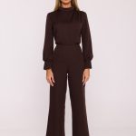 Stylowy kombinezon uszyty z gładkiej tkaniny o matowym wykończeniu to propozycja, która łączy nowoczesny charakter z ponadczasową elegancją. Jednoczęściowa forma pięknie podkreśla sylwetkę, a dopasowana talia i szerokie nogawki 7/8 nadają całości lekkości i swobody. Góra kombinezonu wyróżnia się stójką z delikatnym marszczeniem przy ramieniu, które subtelnie modeluje linię ramion i nadaje wyjątkowego szyku. Długie rękawy zakończono szerokimi mankietami z rozcięciem, podkreślając elegancki charakter projektu. Ozdobne guziki na ramieniu stanowią stylowy detal, dodający całości niepowtarzalności. Model zapinany jest na kryty zamek z tyłu, co zapewnia wygodę zakładania i estetyczne wykończenie. Brak podszewki i kieszeni sprawia, że kombinezon pozostaje lekki, a gładka tkanina pozwala na tworzenie wielu różnorodnych stylizacji, od codziennych po wieczorowe. Zaprojektowany i uszyty w Polsce, stworzony z myślą o kobietach ceniących elegancję, komfort i ponadczasowy design.