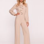 Kobiecy kombinezon uszyty z gładkiej tkaniny o miękkim wykończeniu, łączący elegancję z nowoczesnym detalem. Dekolt w kształcie litery V subtelnie wysmukla sylwetkę, a rękawy długości 7/8 zakończone falbaną nadają całości lekkości i wyjątkowego charakteru. Dopasowana góra harmonijnie łączy się z prostymi nogawkami zaprasowanymi na kant, tworząc spójną, elegancką linię. Talia została podkreślona paskiem z klamerką, który dodatkowo akcentuje kobiecą sylwetkę. Model zapinany jest na kryty zamek z tyłu, bez kieszeni i podszewki, co czyni go lekkim i komfortowym w noszeniu. Idealny wybór na eleganckie przyjęcia, spotkania biznesowe i specjalne okazje. Zaprojektowano i uszyto w Polsce.