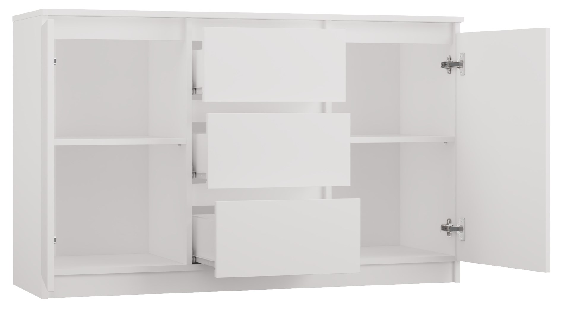 Upewnij się, że komoda jest stabilnie ustawiona i ewentualnie przymocowana do ściany, aby uniknąć przewrócenia., Uważaj podczas montażu, aby nie uszkodzić krawędzi ani powierzchni., Nie obciążaj nadmiernie półek ani szuflad, aby zapobiec uszkodzeniu.