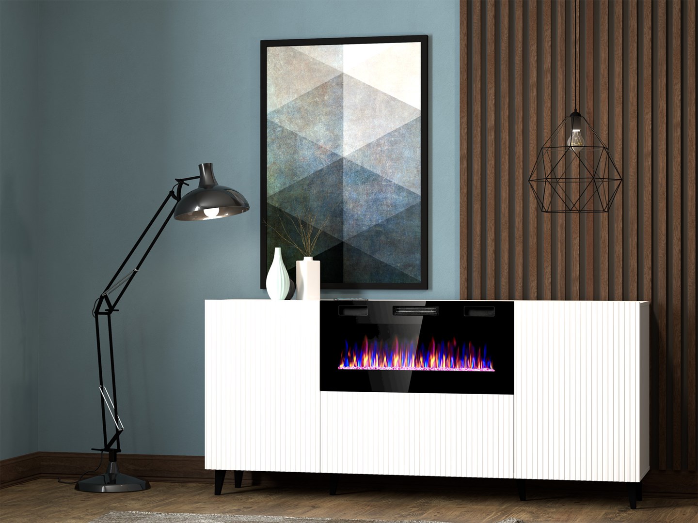 Na środku jedna klapa otwierana do dołu, Kolory płomieni: czerwony, niebieski, fioletowy/różowy, Bezuchwytowe fronty, Funkcja grzewcza: 16-28 ℃, Wewnątrz szafek po jednej półce, Meble do samodzielnego montażu, Wyposażony w kominek elektryczny