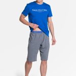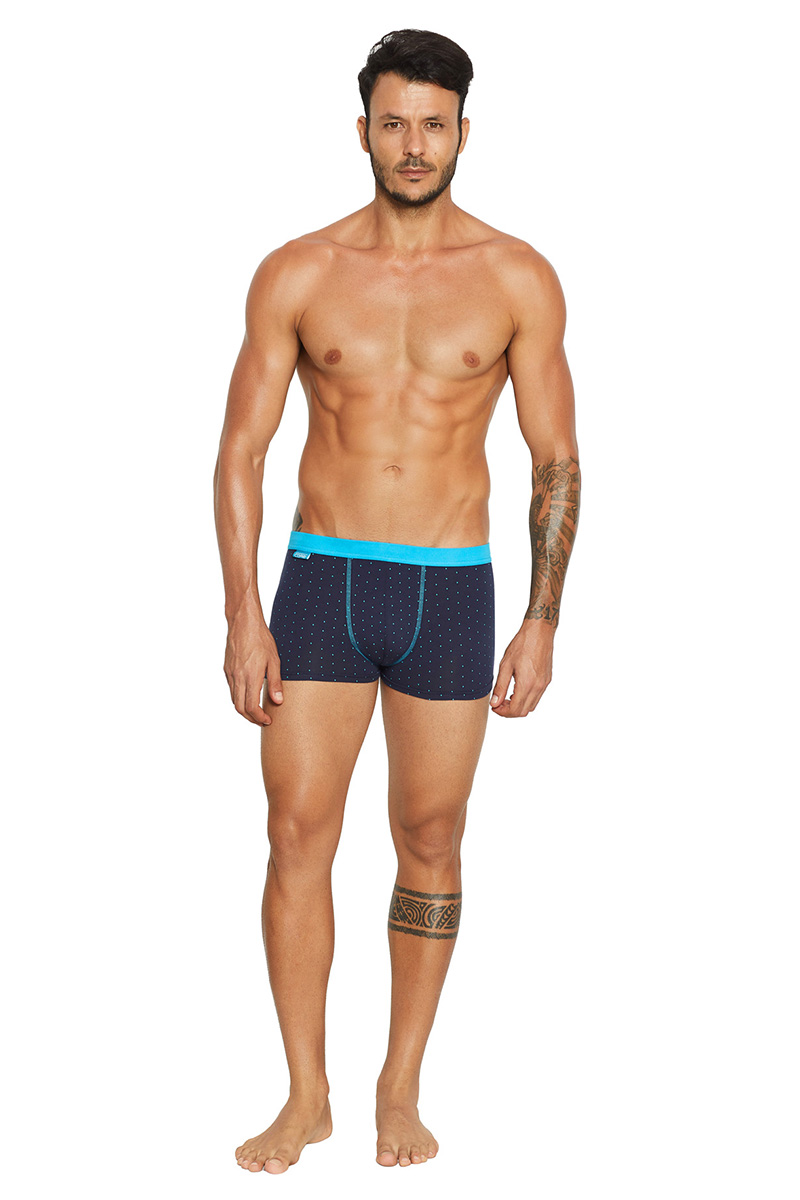 Zestaw 2 sztuk męskich bokserek w granatowo-niebieskim kolorze. Jedne w paski, drugie w kropki, obie obszyte kontrastową nicią. Miękka dzianina bawełniana. W pasie gładka guma.