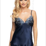 Wyjątkowy komplet uszyty z włoskiej satyny, w pięknym, błękitnym kolorze. Dwuczęściowy, z bluzeczką na ramiączkach o regulowanej długości i miseczkami o konstrukcji soft (bez fiszbin), pokrytymi wykwintnym, haftowanym tiulem. Satyna najwyższej jakości, miękka, perłowa i przyjemna w dotyku. Kolor od razu wpada w oko. Spodenki typu szorty z kokardkami po bokach, stanowią tu doskonałe dopełnienie bluzeczki i jednocześnie dają pełną swobodę. Świetny zestaw również na urlop.