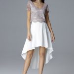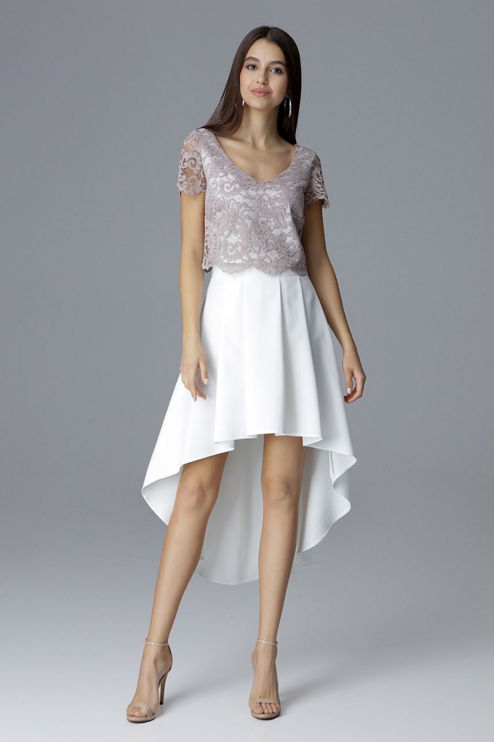 Piękny koronkowy top z asymetryczną spódnicą to świetna propozycja dla modnych i lubiących bawić się modą kobiet. Top z elastyczną podszewką dodaje komfortu noszenia, krótki rękaw z koronki i delikatny dekolt pięknie podkreśla sylwetkę. To typowy must have tego sezonu.