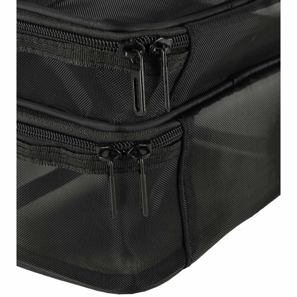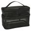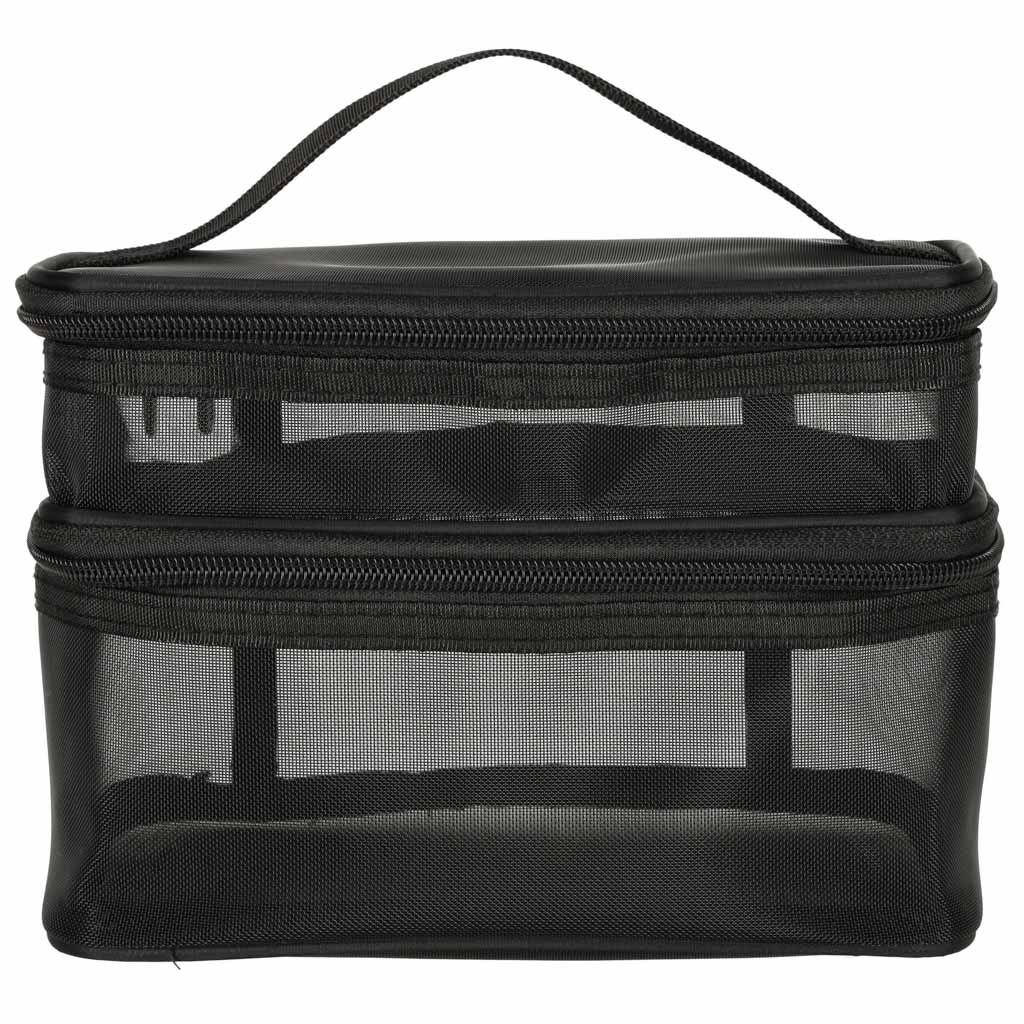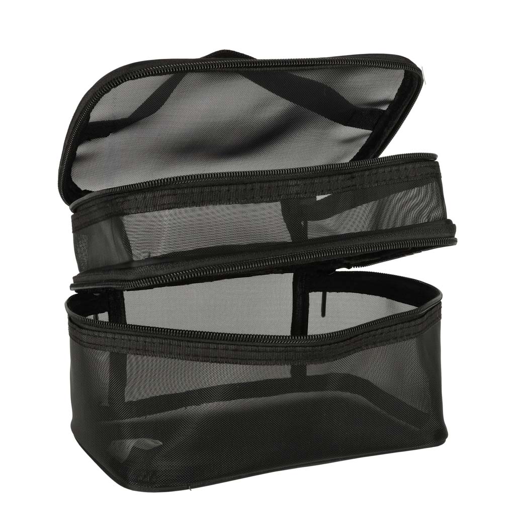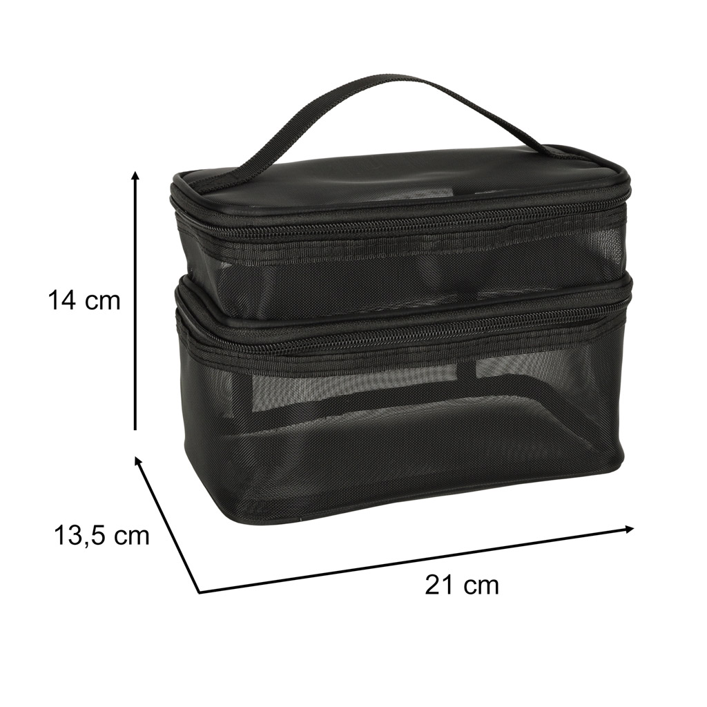 Czarna kosmetyczka podróżna z siateczki. Posiada dwie przegrody zapinane na zamek błyskawiczny. Wyposażona w rączkę do łatwego przenoszenia. Tworzywo: poliester. Wymiary: 21 cm x 13,5 cm x 14 cm.