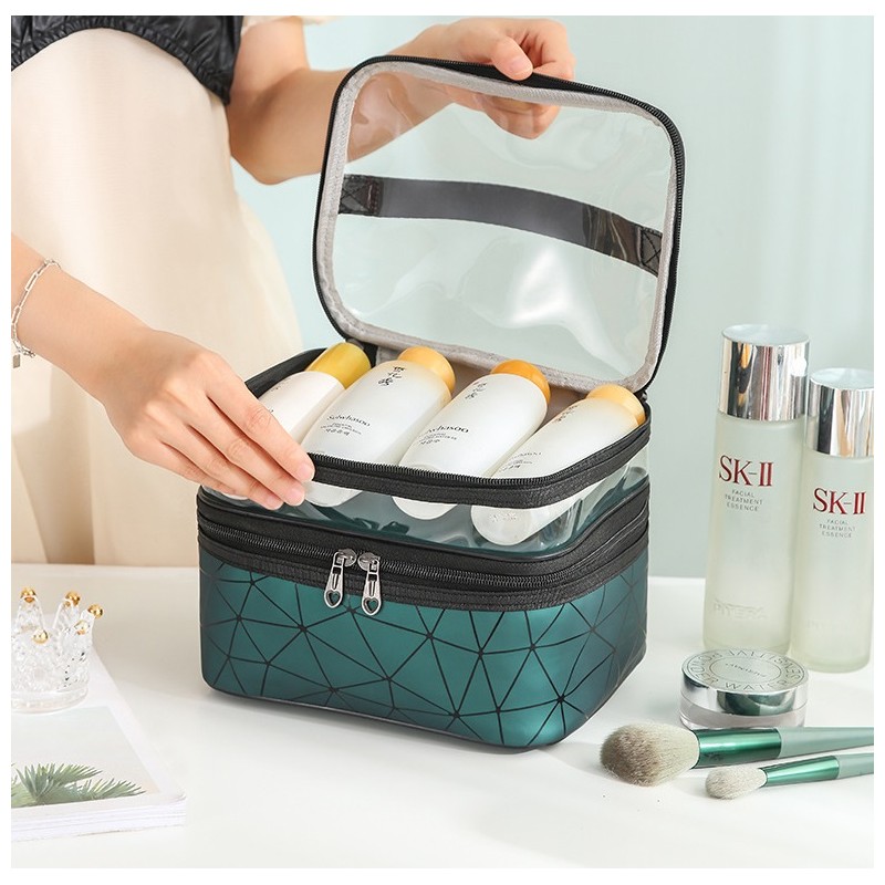 Piękna, damska rozkładana kosmetyczka, dostępna w kolorze zielonym z geometrycznymi wzorami. Wykonana z miękkiego, śliskiego materiału. Bardzo praktyczna i uniwersalna.