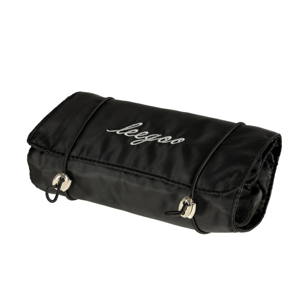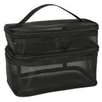 Czarna kosmetyczka podróżna. Można ją zwinąć w rulon, dzięki czemu zajmuje mniej miejsca w bagażu. Posiada cztery przegródki, które można wypiąć. Ścianki z siatki ułatwiają znalezienie kosmetyków. Długość kosmetyczki: 53 cm. Tworzywo: poliester.