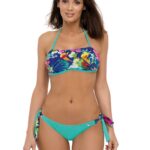 Stylowy kostium kąpielowy uszyty z wyjątkowej, barwnej tkaniny, w którym jeden kolor płynnie przechodzi w drugi, tworząc intrygującą całość. Podkreślony egzotyczną kolorystyką. Seksowny, dzięki konstrukcji biustonosza. Miseczki z fiszbinami i dużym wypełnieniem push-up, umieszczonym na stałe w modelu (bez możliwości jego wyjęcia). Push-up znajduje się w każdym rozmiarze. Świetnie zbiera i unosi piersi, a do tego powiększa je niemal dwukrotnie. Zachwyca i kusi już od pierwszego spojrzenia. Ramiączka z możliwością całkowitego wypięcia z modelu. Majteczki o dobrym kroju „midi”, ładnie zdobią biodra i dają pełną wygodę. Wiązania po bokach pozwolą dopasować je do Twoich potrzeb. Tkanina włoska, wysokiej jakości.
