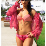 Dwuczęściowy kostium kąpielowy z wygodnymi figami, zdobiony kwiecistym dekorem. Dekor z delikatnym, białym, nadrukiem ze szczyptą złotego koloru. Całość idealnie podkreśla opaleniznę. Miseczki usztywniane, bez push-up-a, inspirowane bikini. Ramiączka wygodnie wiązane zarówno na szyi jak i na plecach. Figi klasyczne, typu midi, gładkie z tyłu stanowią doskonałe dopełnienie kompletu. Uwaga! Kostium nie zawiera wisiorka widocznego na zdjęciu (pomiędzy miseczkami).
