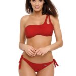 Stylowy kostium kąpielowy, w którym pięknie zaprezentujesz się na plaży. Biustonosz z trójkątnymi miseczkami usztywnianymi specjalną pianką, wzbogacony push-up-em dzięki niemu piersi uniosą się i optycznie powiększą, tworząc zmysłowy, głęboki dekolt. Push-up umieszczony jest w kostiumie na stałe i nie jest wyjmowany z modelu, występuje w każdym rozmiarze kostiumu. Biustonosz zwraca także uwagę modnym dodatkiem w postaci „pasków-gumek” umieszczonych przy dekolcie. Ładne ramiączka wiązane na szyi, zdobione delikatną, biżuteryjną ozdobą (można ją zdjąć), będą atrakcyjnie prezentować się w promieniach słońca. Majteczki o doskonałym kroju „midi” o wyśrodkowanej wysokości. Są wzorzyste i ozdobnie wiązane na boku (klasyczny, wkładany krój).