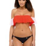 Stylowy kostium kąpielowy, w którym pięknie zaprezentujesz się na plaży. Biustonosz z trójkątnymi miseczkami usztywnianymi specjalną pianką, wzbogacony push-up-em dzięki niemu piersi uniosą się i optycznie powiększą, tworząc zmysłowy, głęboki dekolt. Push-up umieszczony jest w kostiumie na stałe i nie jest wyjmowany z modelu, występuje w każdym rozmiarze kostiumu. Biustonosz zwraca także uwagę modnym dodatkiem w postaci „pasków-gumek” umieszczonych przy dekolcie. Ładne ramiączka wiązane na szyi, zdobione delikatną, biżuteryjną ozdobą (można ją zdjąć), będą atrakcyjnie prezentować się w promieniach słońca. Majteczki o doskonałym kroju „midi” o wyśrodkowanej wysokości. Są wzorzyste i ozdobnie wiązane na boku (klasyczny, wkładany krój).