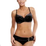 Sophie M-531 to elegancki, dwuczęściowy kostium kąpielowy, szyty do rozmiaru 50. Wykonany z włoskiej, gładkiej, matowej tkaniny, najwyższej jakości. Utożsamia kobiecość i ponadczasowy styl. Biustonosz posiada dobrze wyprofilowane, usztywniane miseczki z fiszbinami, które wspaniale zbierają i modelują piersi. Fason ładnie zbiera, unosi i utrzymuje biust w atrakcyjnej pozycji. Dodatkowo rozmiary 40/C i 42/D posiadają wypełnienie push-up, które umieszczono w biustonoszu na stałe, bez możliwości jego wyjęcia, a które przy mniejszych rozmiarach kostiumu pozwala nieco powiększyć piersi i tym samym poprawić proporcje ciała. Pozostałe rozmiary nie posiadają push-up-a. Obwód wygodnie wiązany na plecach. Figi wyższe niż zazwyczaj, delikatnie kryją większą partię ciała niż w tradycyjnych, niskich figach, są subtelnie marszczone z przodu i bardzo wygodne. Kolekcja Lato 2019.