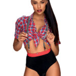Wspólna, nocna zmiana? Kostium Worker Girl będzie idealny! W zestawie otrzymasz wiązaną na biuście, krótką koszulę w czerwono-niebieską kratę oraz wysokie, elastyczne figi z szelkami (szelki są odpinane tylko z przodu bielizny). Figi o brazylijskim kroju, zdecydowanie eksponują pośladki.
