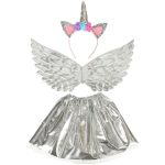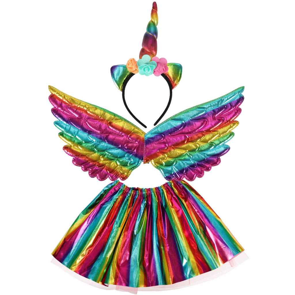 Strój jednorożca z uszami, rogiem, skrzydłami i spódniczką będzie