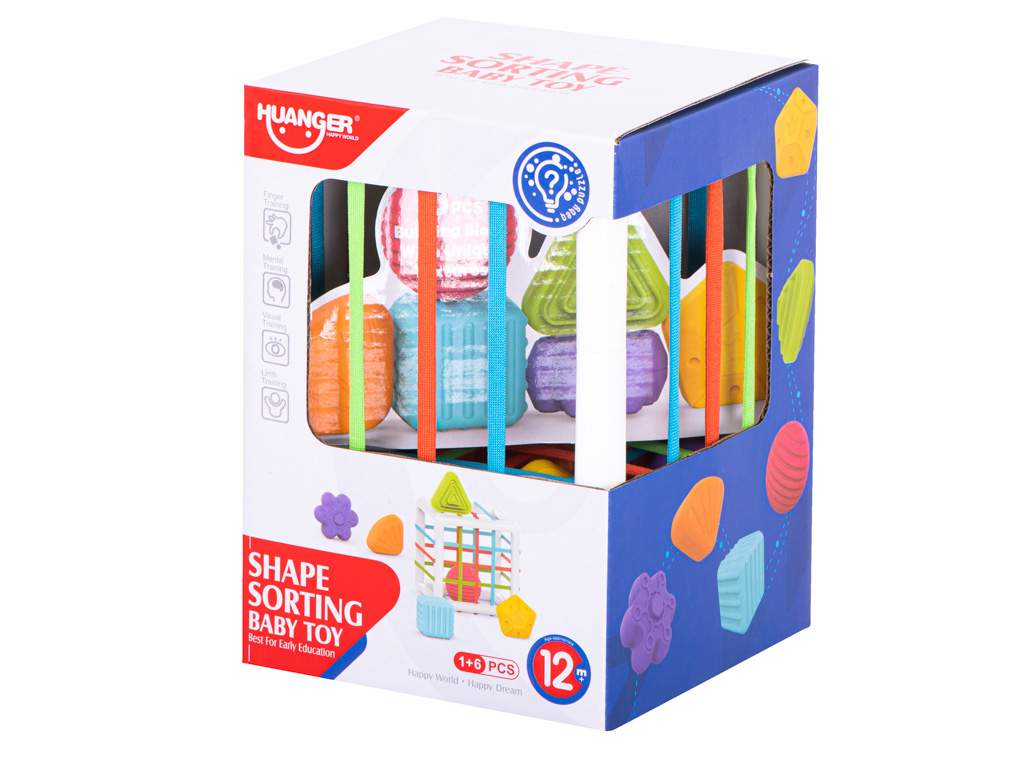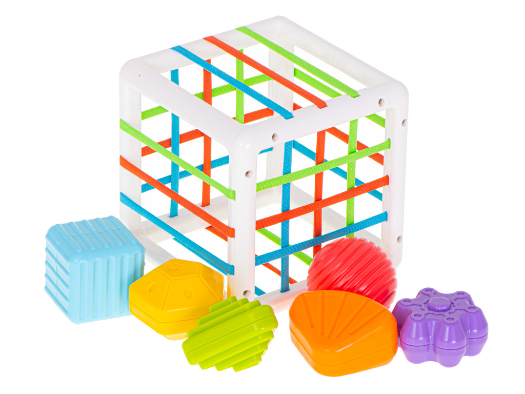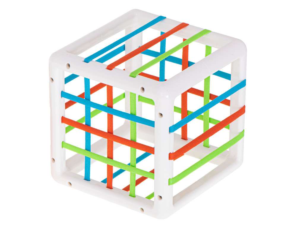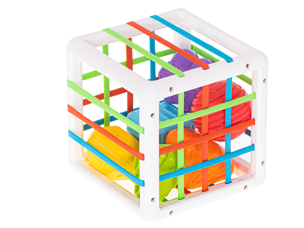 Ciekawa kostka-sorter z elastycznymi paskami. Zabawa polega na włożeniu klocków przez gumki do wnętrza kostki. Zabawa pobudzi logiczne myślenie oraz zmysł wzroku i dotyku W zestawie: kostka oraz 6 kolorowych sensorycznych klocków. Wym.: 12x12x12cm.