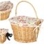 Wiklinowy kosz rowerowy z materiałowym wkładem w kwiaty. Posiada rączkę do łatwego przenoszenia. Mocowanie typu „click” ułatwia odpinanie i przypinanie koszyka. W zestawie elementy do montażu. Tworzywo: wiklina, poliester. Wymiary: 26 cm x 43 cm x 23 cm.