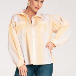 Koszula damska z delikatnym wzorem w paski. Model z obszernymi rękawami z marszczeniem. Wiązanie na dole.