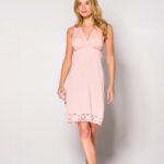 Koszula nocna z krótkimi rękawkami. Obszyta koronką przy dekolcie, dodatkowo umieszczono na nim satynowe kokardki. Dekolt typu łódka. Wykonana z lejącego, elastycznego materiału. Zapewnia uczucie swobody i komfortu. Produkt dostępny w dwóch kolorach.