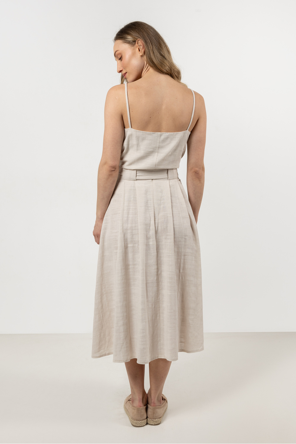 Minimalistyczny i uniwersalny, ten top to must-have na ciepłe dni. Wykonany z naturalnej, miękkiej bawełny, zapewnia przewiewność i komfort noszenia. Cienkie ramiączka subtelnie podkreślają ramiona, a długość do bioder sprawia, że doskonale komponuje się zarówno ze spódnicami, jak i spodniami. Świetnie sprawdzi się w codziennych i eleganckich stylizacjach. Połącz top ze spódnicą z tej samej tkaniny lub z bermudami. Stworzysz wygodny letni komplet.
