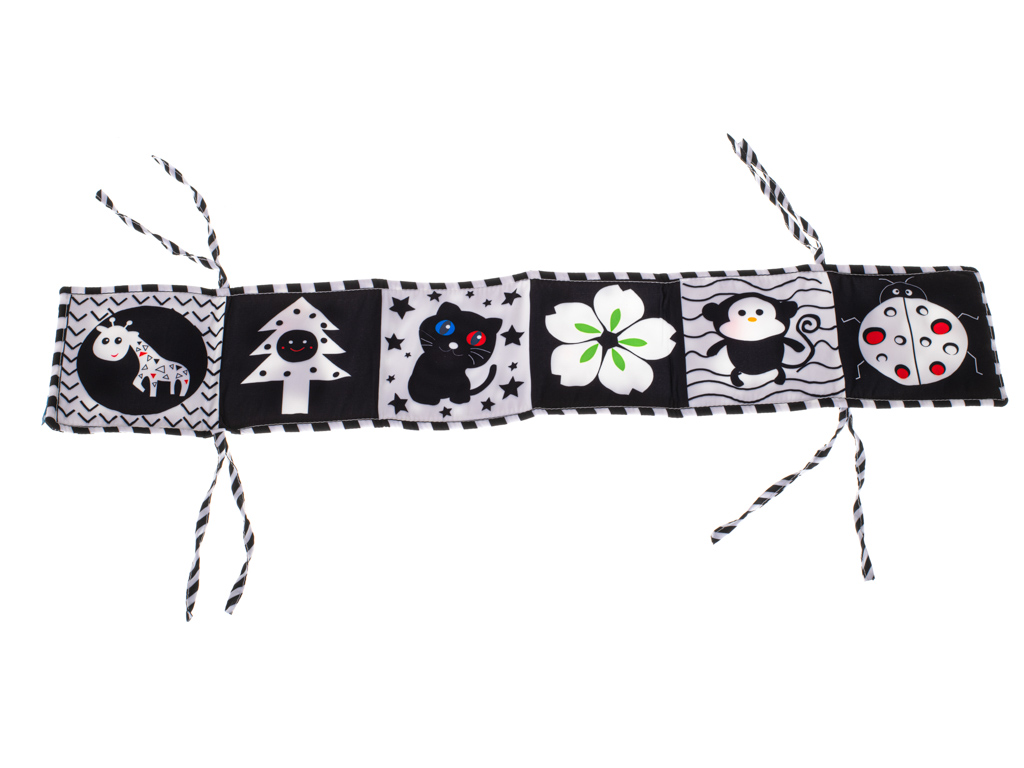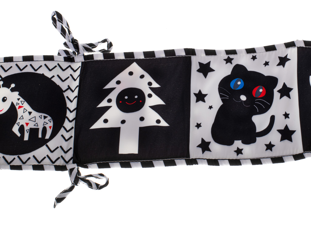 Dwustronny, składany ochraniacz na łóżeczko złożony z sześciu obrazków. Kontrastowe kolory i szeleszczące strony zaciekawią dziecko oraz pobudzą zmysł wzroku i dotyku. Materiał: poliester. Wzór: biedronka. Wymiary po rozłożeniu: 82×15,5cm.