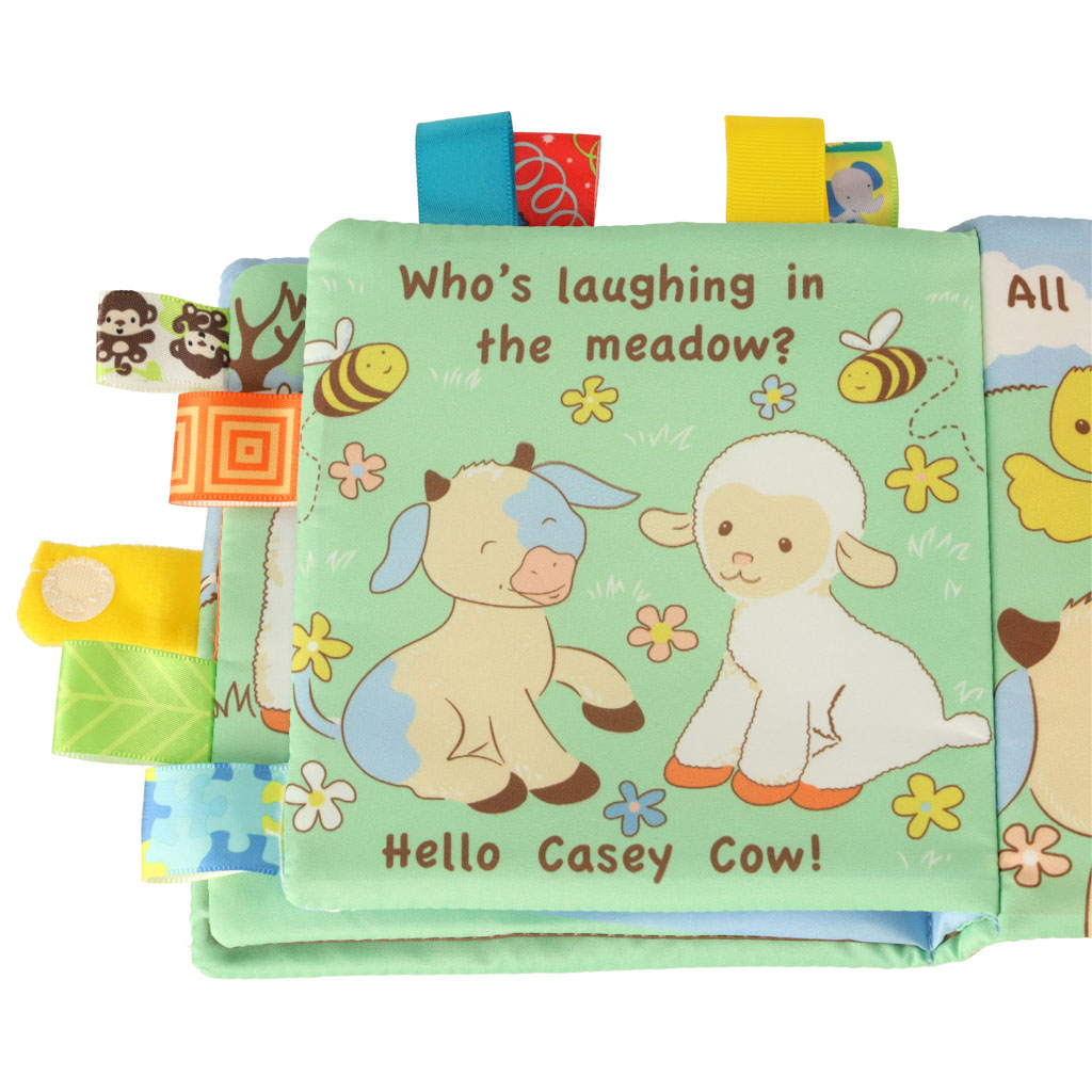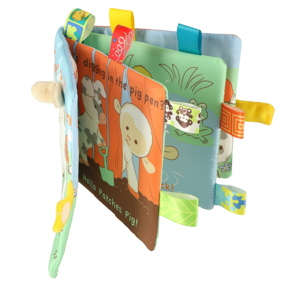 Sensoryczna książeczka przedstawiająca przygody owieczki. Osiem stron zawiera napisy w języku angielskim. Ciekawe kolory zachęcą do zabawy. Dzięki wykorzystaniu różnych materiałów książeczka pobudzi zmysł dotyku, słuchu i wzroku. Wymiary: 14×14,5cm.