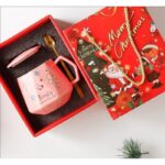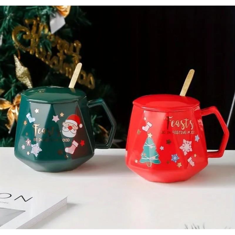 KUBEK CERAMICZNY CZERWONY z motywem świątecznymzestaw z pokrywką i łyżeczką