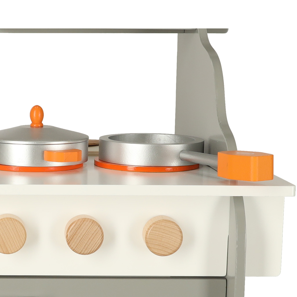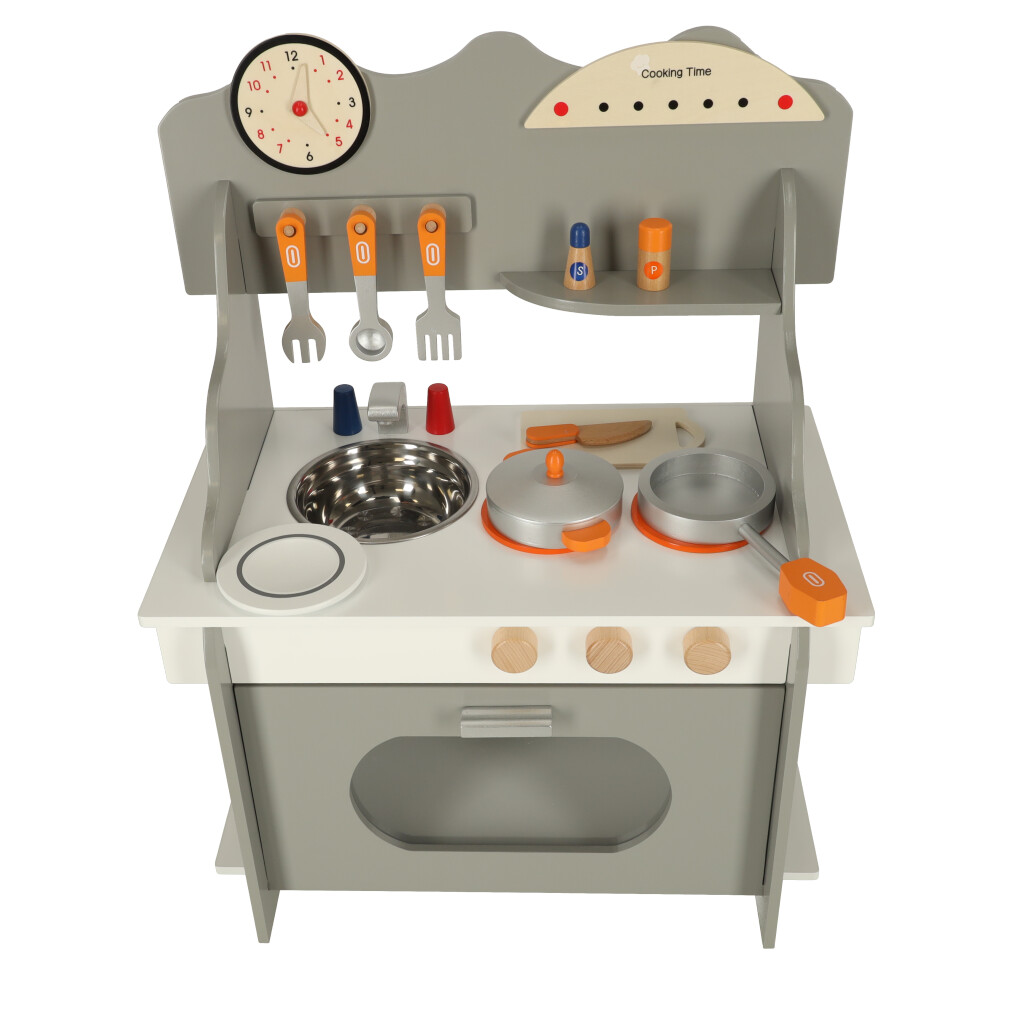Dziecięca kuchnia drewniana z całym niezbędnym wyposażeniem – duży piekarnik, zlew i kuchenka. Dodatkowo akcesoria takie jak patelnia, garnek, szpatułki oraz przyprawy. Doskonale rozwija kreatywność, a także zdolności manualne. Wymiary: 69,5 x 52 x 29,6cm