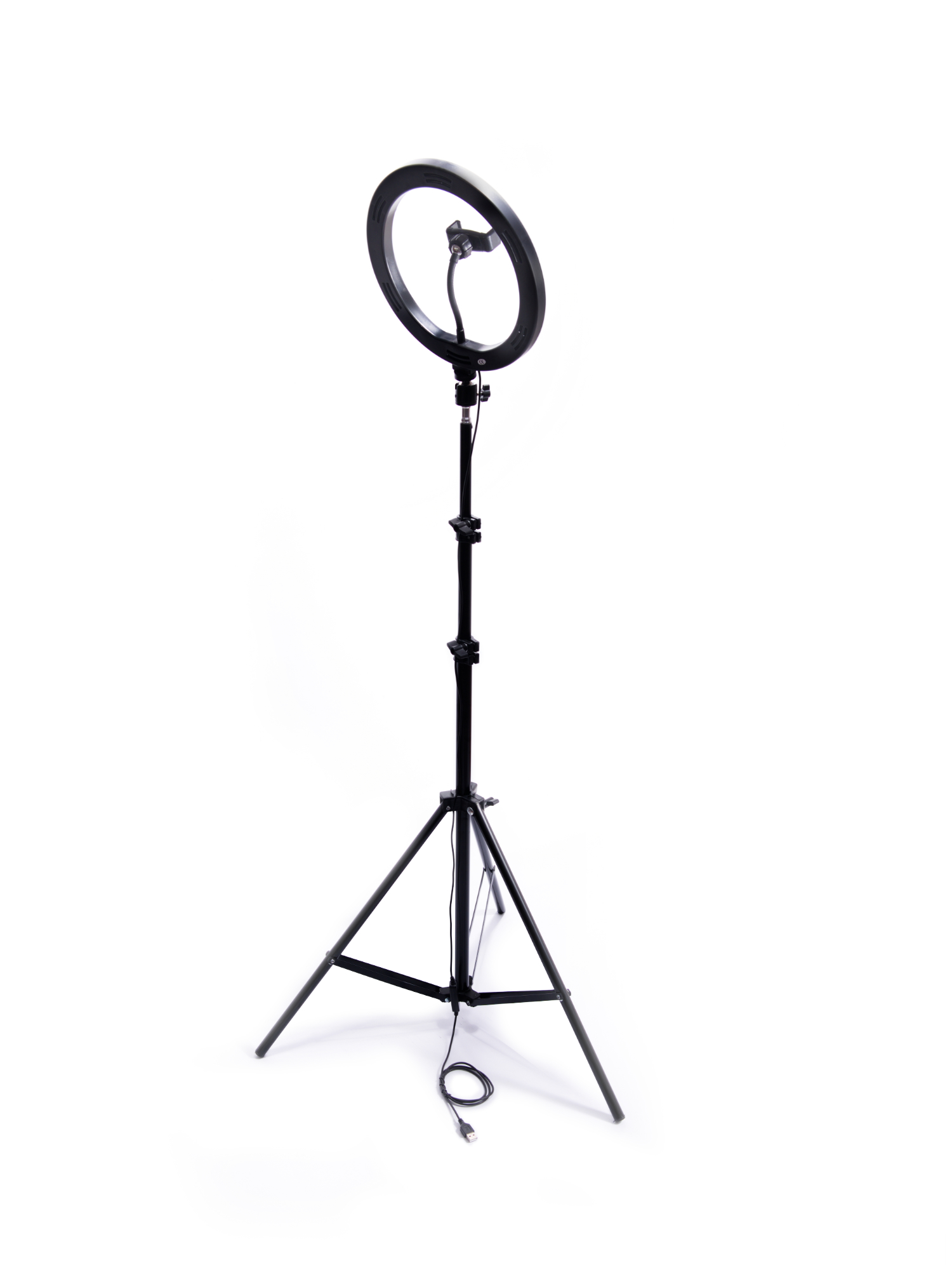 Lampa pierścieniowa LED sterowana pilotem. Posiada regulację natężenia światła. Sprawdzi się podczas wykonywania makijażu lub nagrywania filmów. W zestawie: lampa, uchwyt na telefon, głowica obrotowa, regulowany statyw. Moc: 60W. Max. wys.: 220cm.