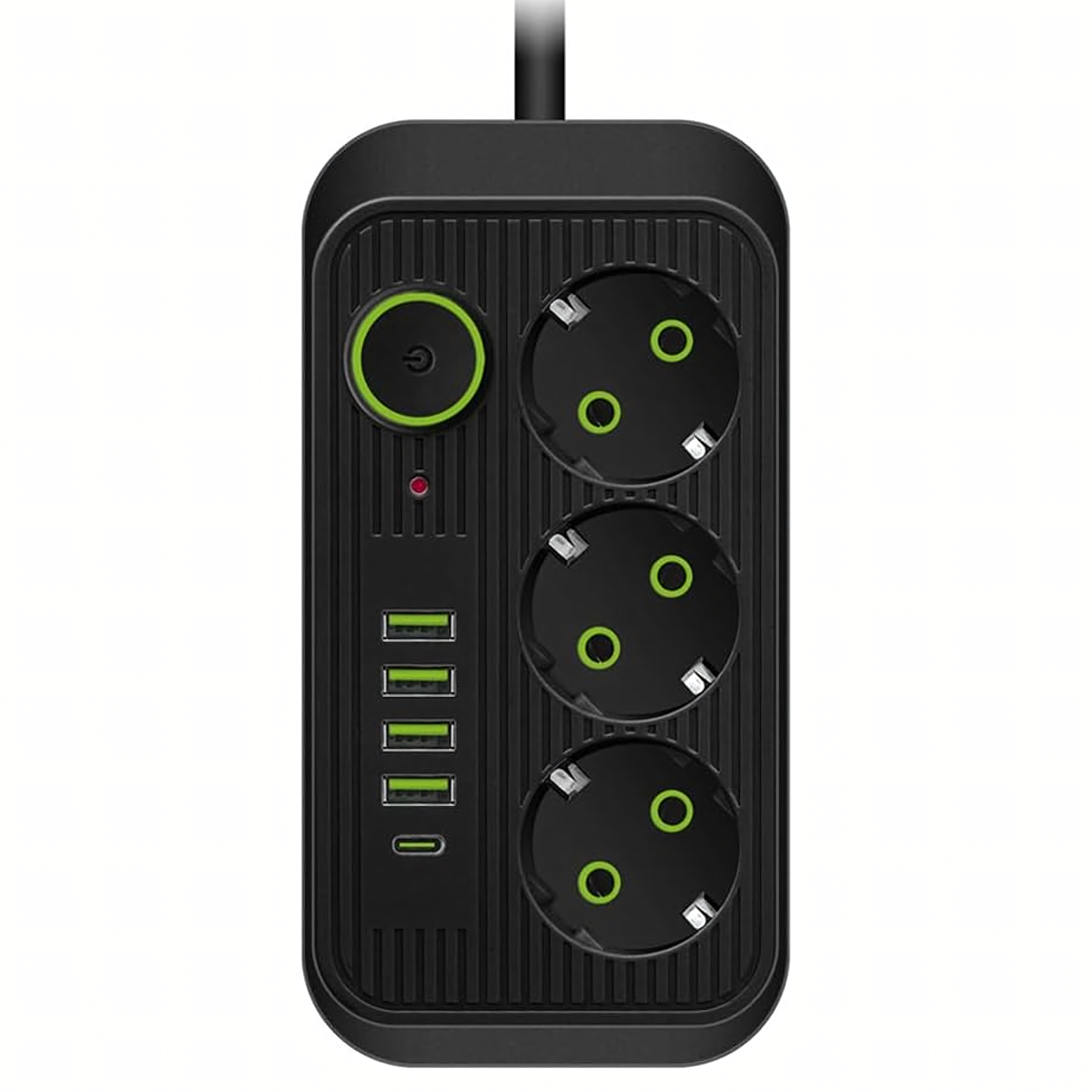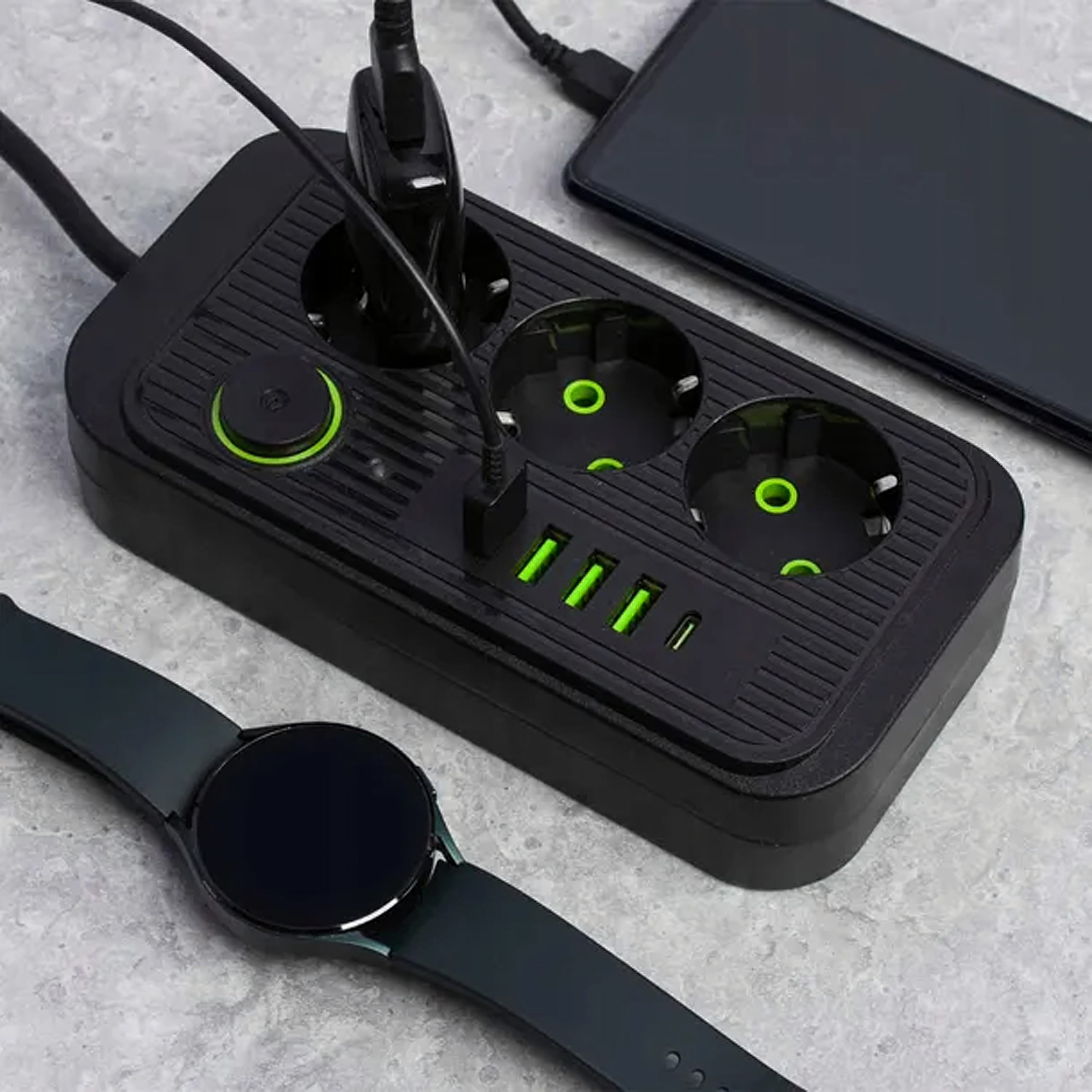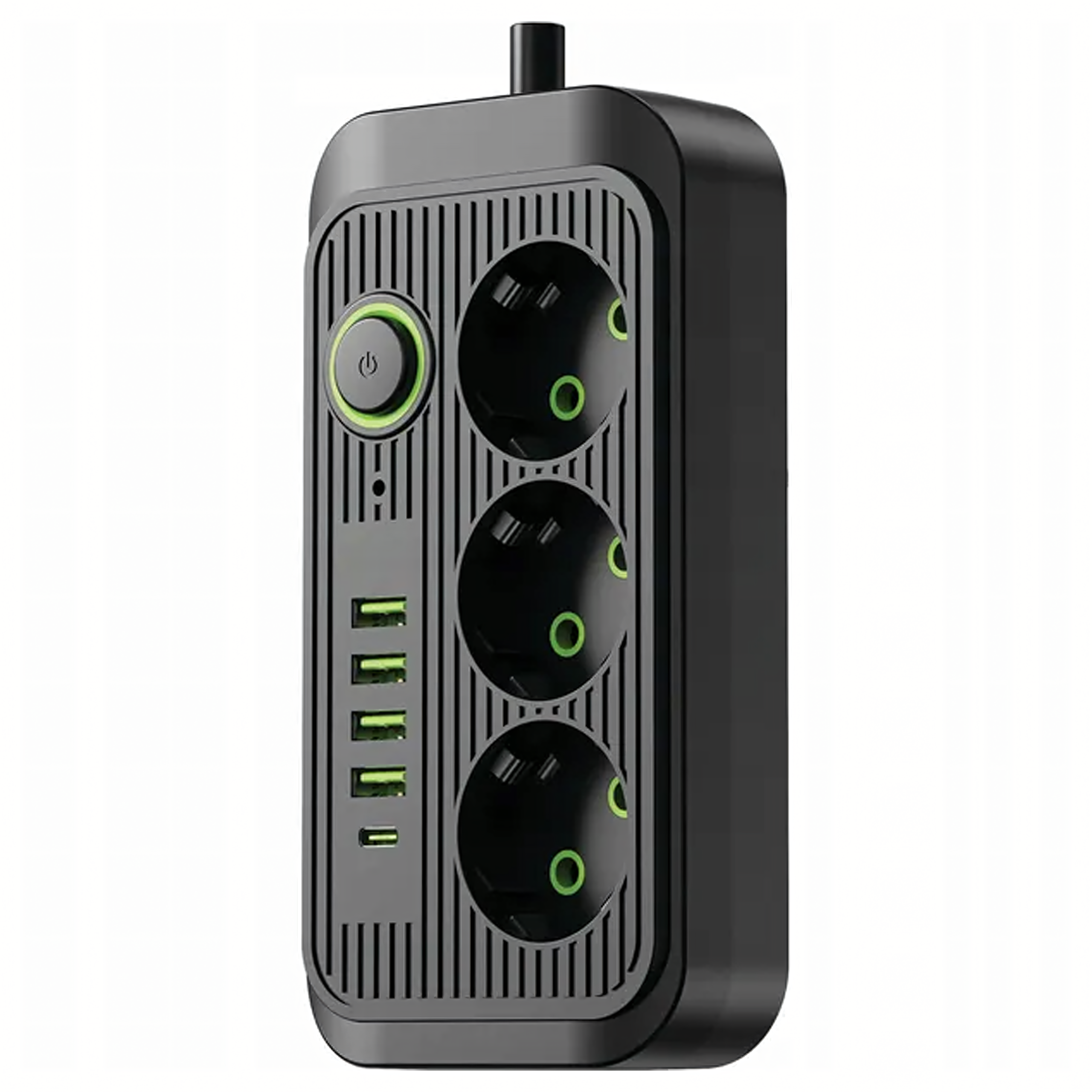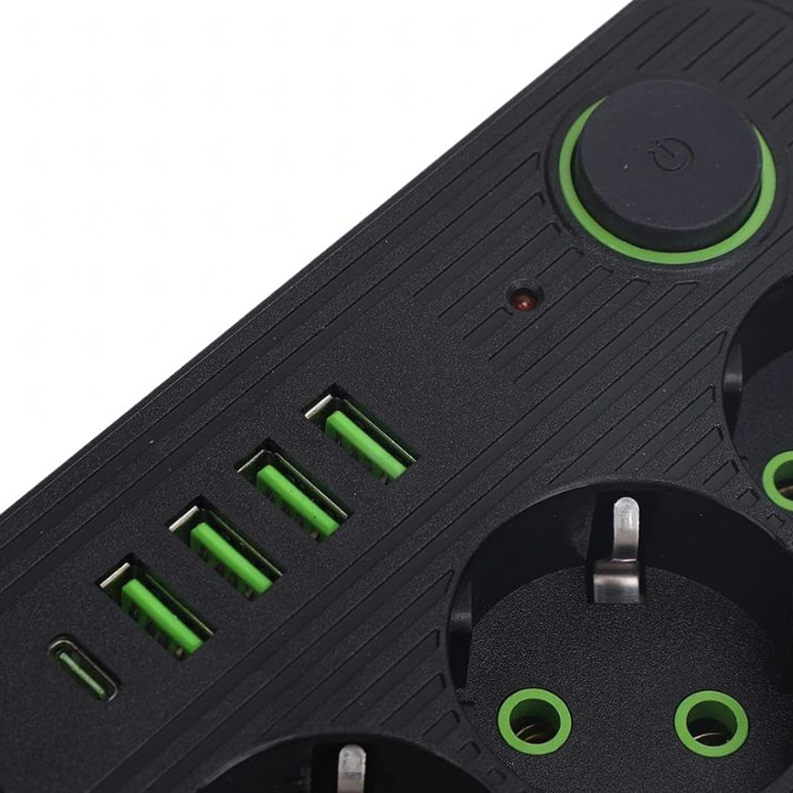 Przedłużacz/listwa zasilająca 2m z 3 gniazdami 230V, 4 portami USB-A i 1 USB-C – idealny do domu i biura. Wyposażony w podświetlany włącznik, zabezpieczenia przeciwprzepięciowe i ergonomiczny układ gniazd, umożliwia jednoczesne zasilanie i ładowanie wielu urządzeń w pełnym bezpieczeństwie.