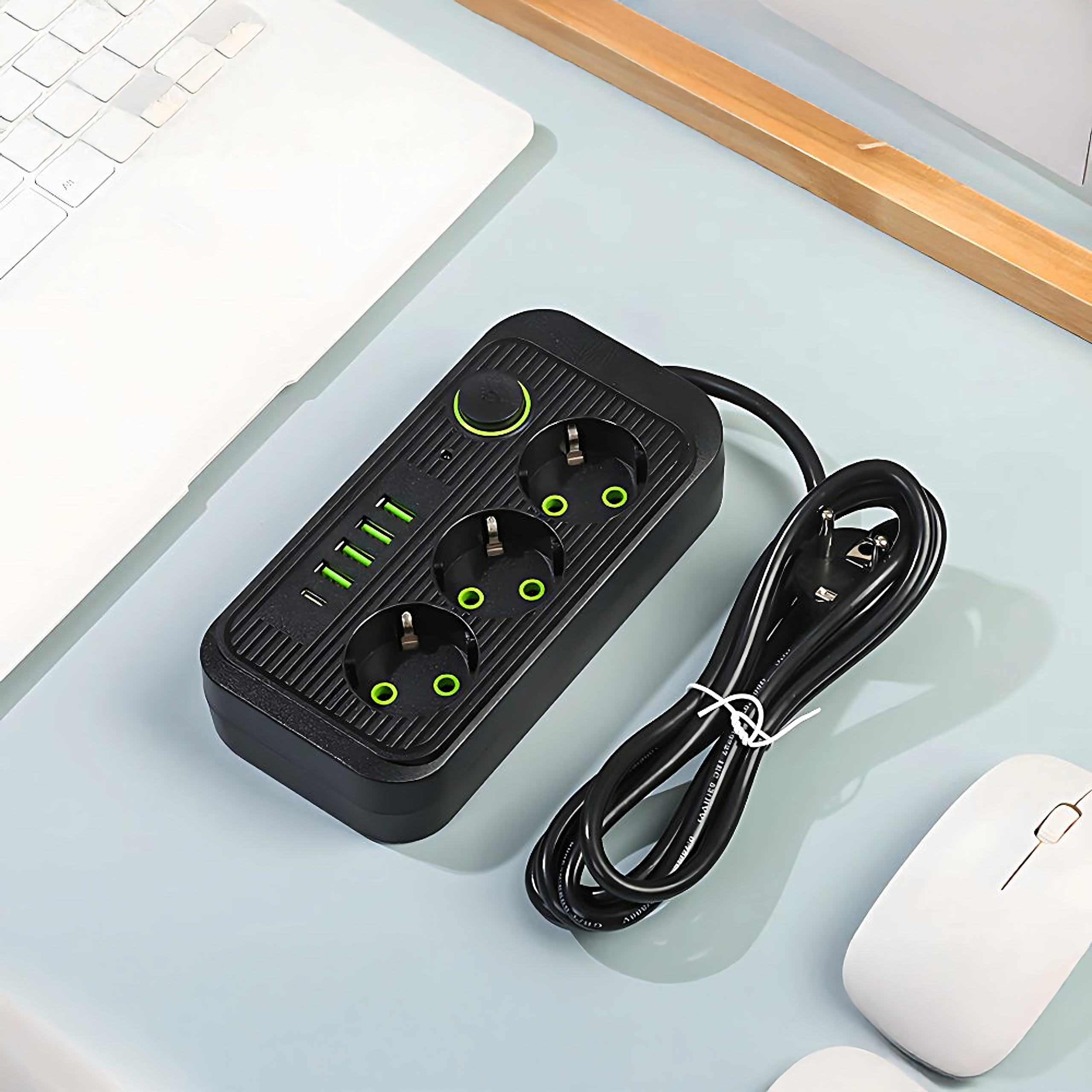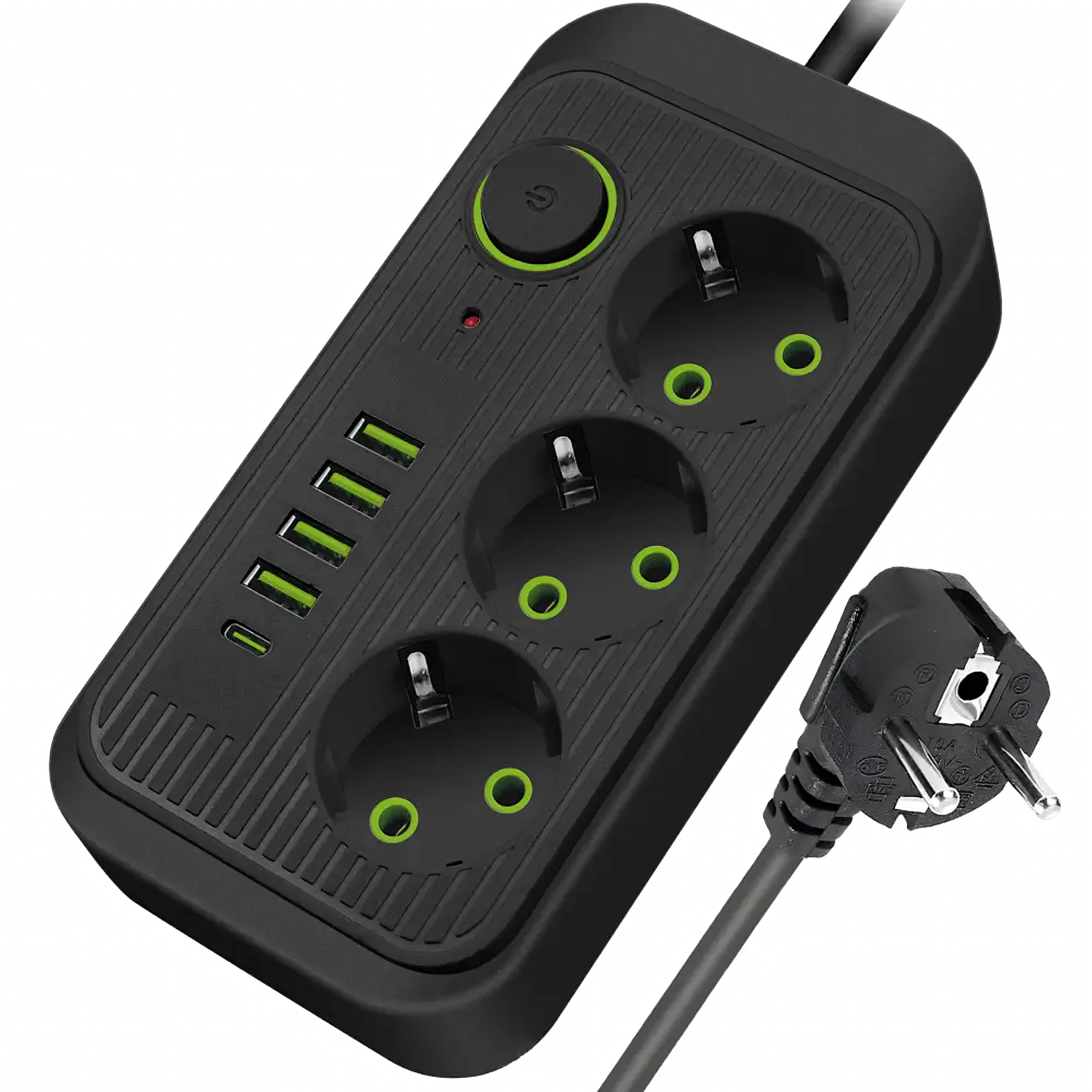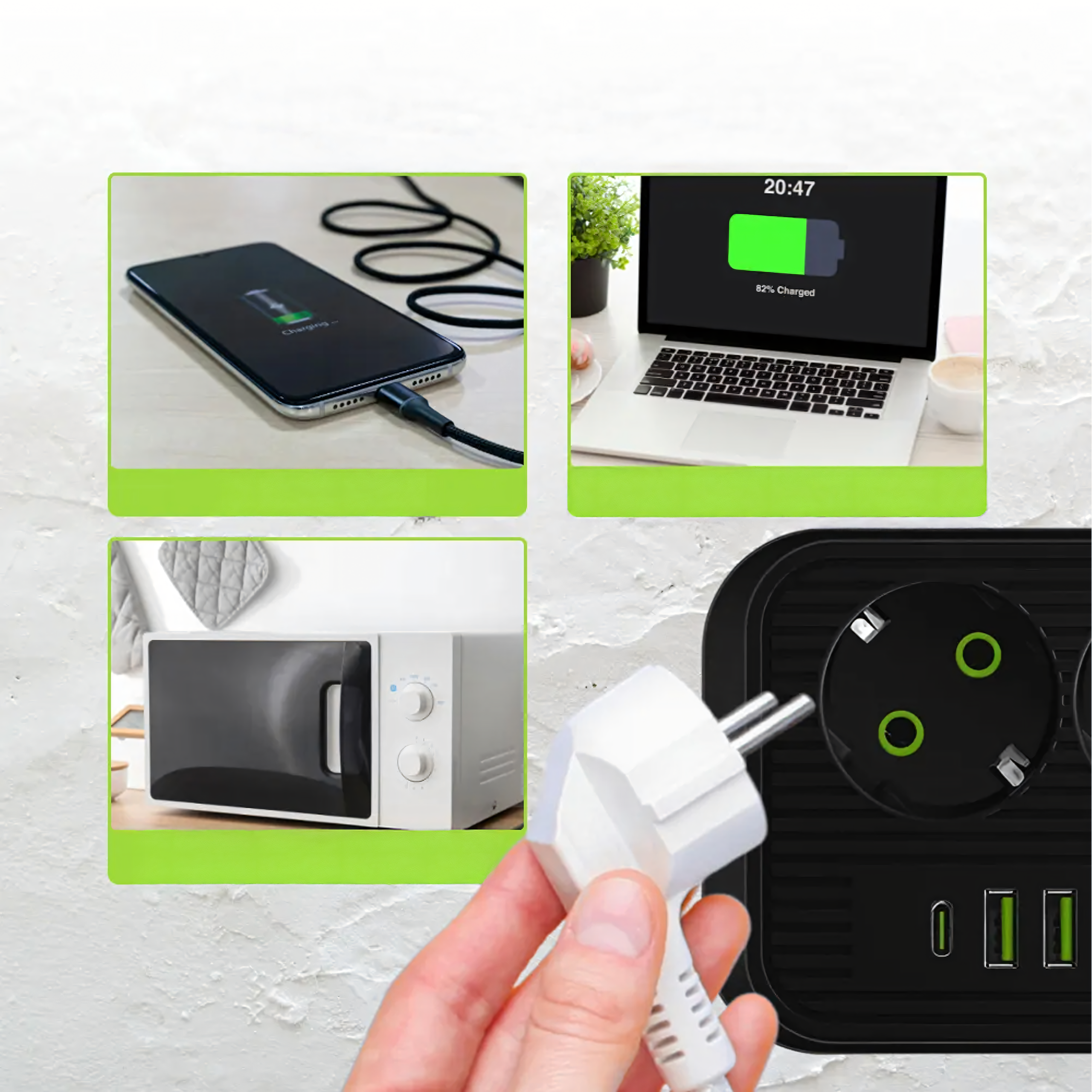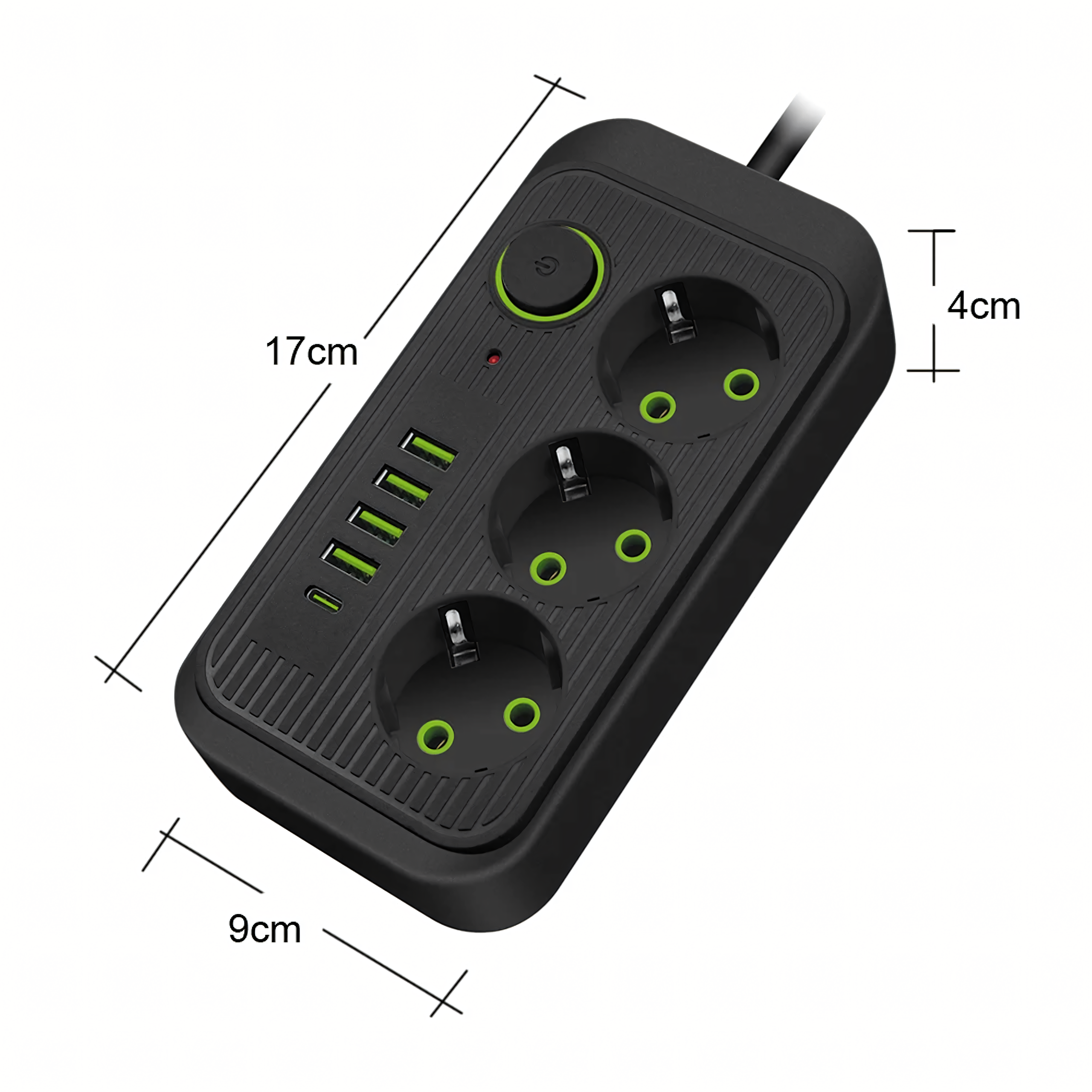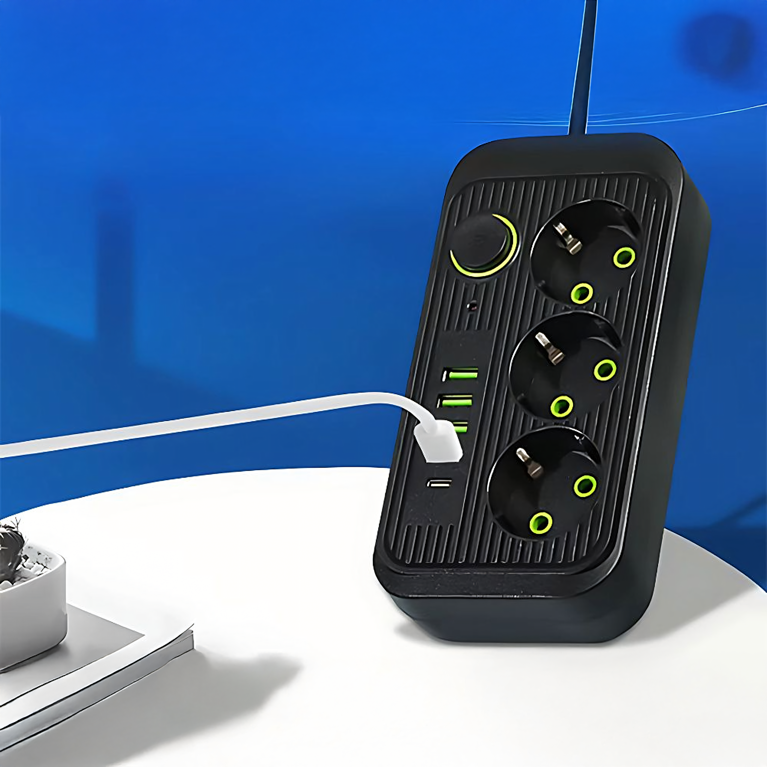 Przedłużacz/listwa zasilająca 2m z 3 gniazdami 230V, 4 portami USB-A i 1 USB-C – idealny do domu i biura. Wyposażony w podświetlany włącznik, zabezpieczenia przeciwprzepięciowe i ergonomiczny układ gniazd, umożliwia jednoczesne zasilanie i ładowanie wielu urządzeń w pełnym bezpieczeństwie.