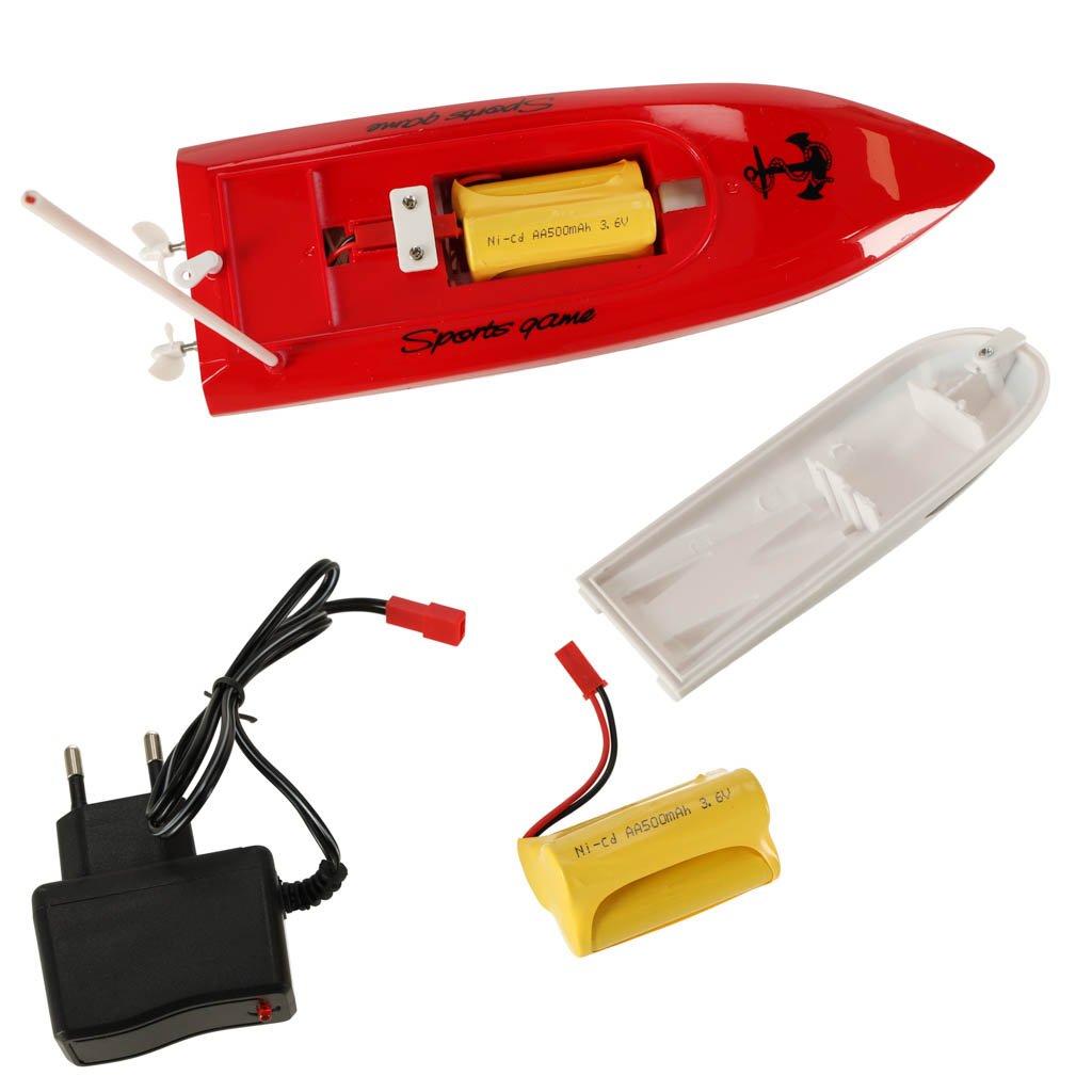 Wodoodporna łódka zdalnie sterowana. Częstotliwość: 27MHz. Zasięg do 20m. Prędkość do 20 km/h. Zasilanie: akumulator Ni-Cd 3,6V 500mAh; 2 baterie AA. Wymiary: 24x8x7,5cm.