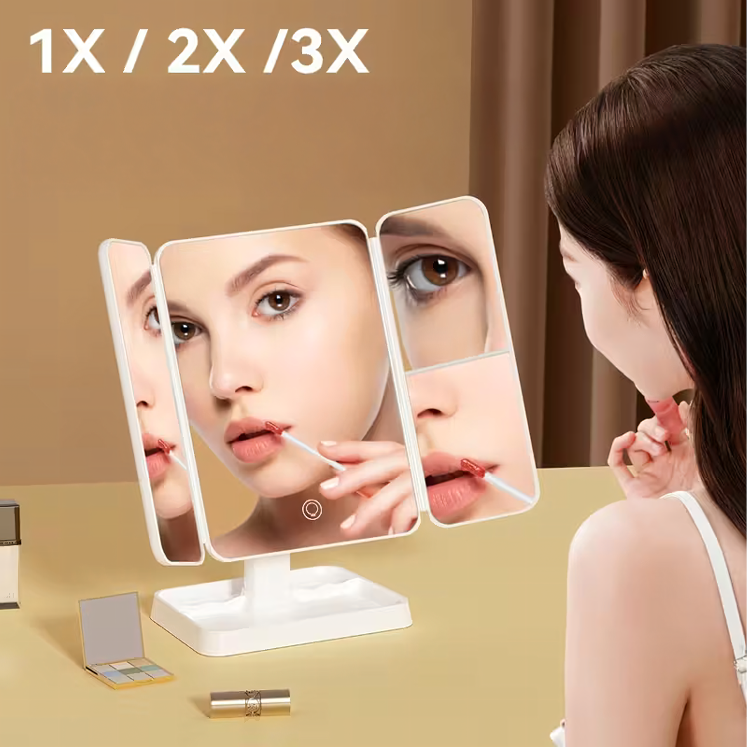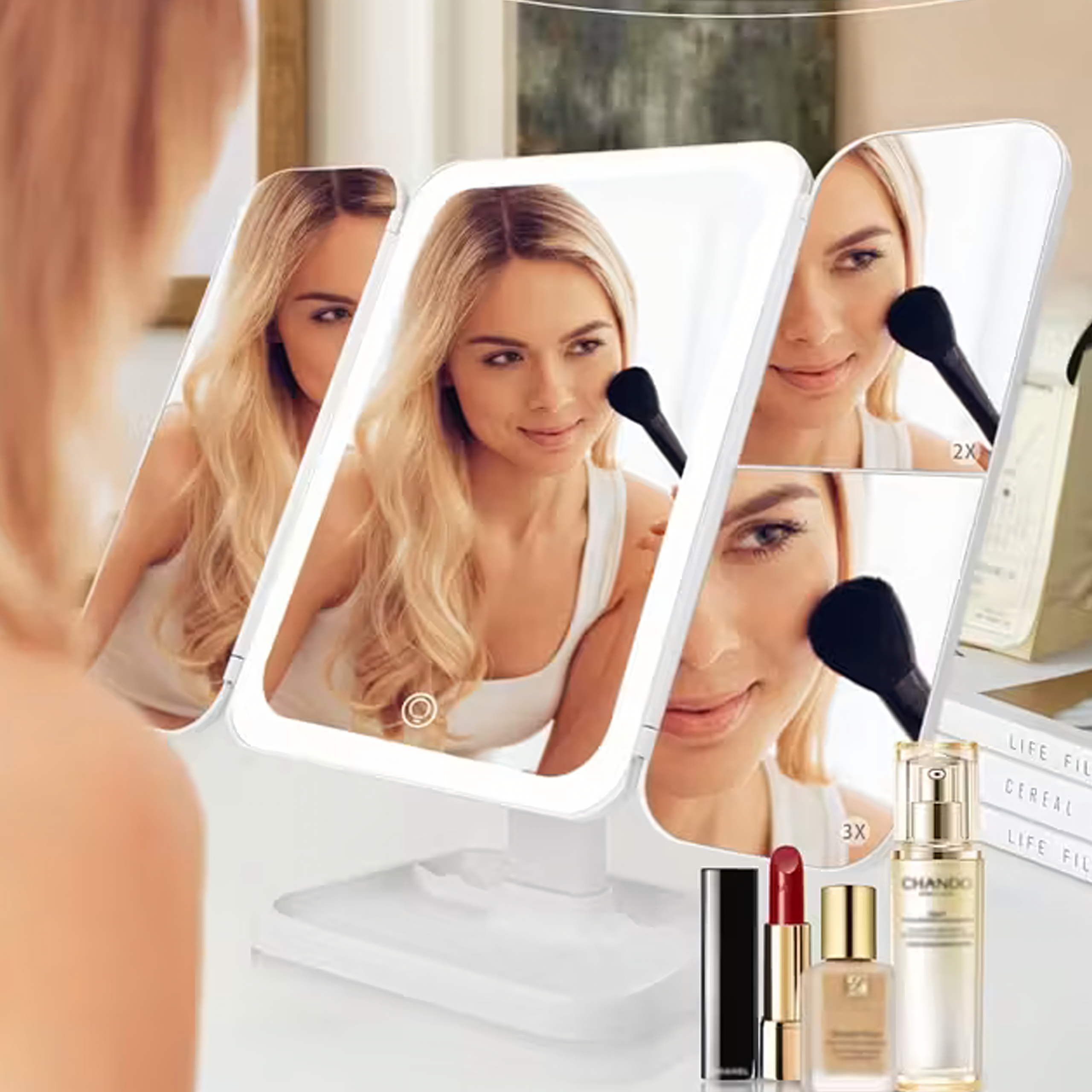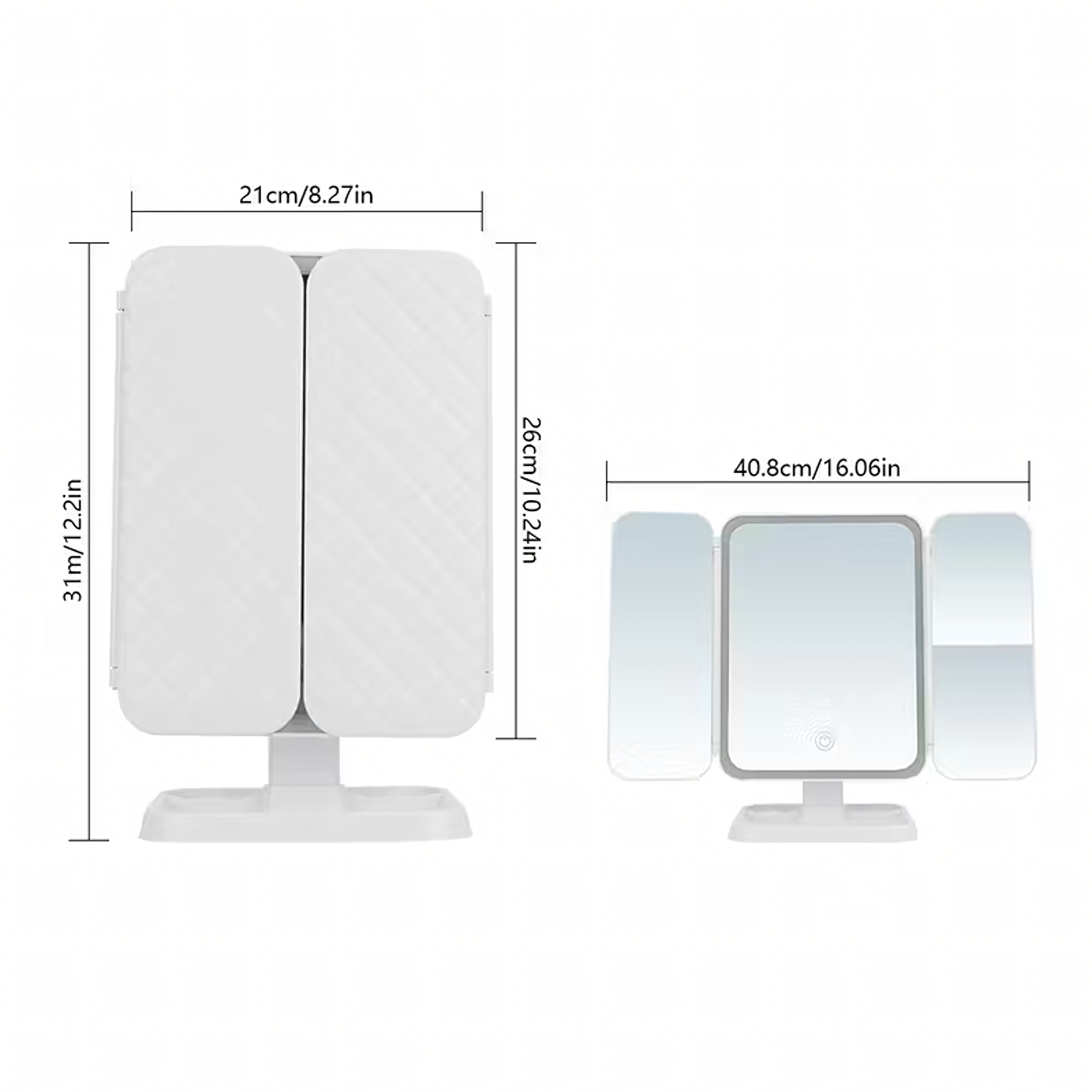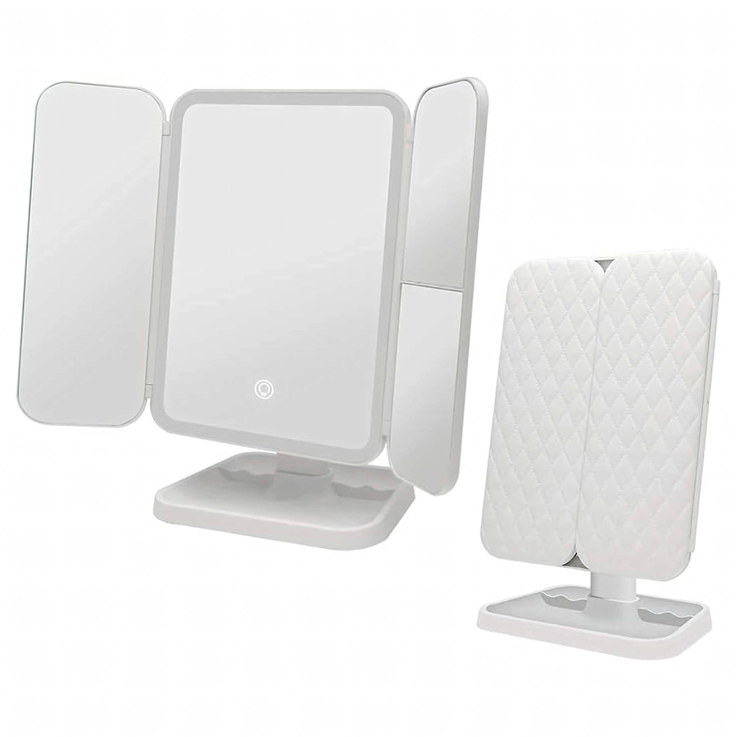 To eleganckie podświetlane lusterko LED z potrójnym panelem i regulacją kąta sprawi, że każdy detal Twojego makijażu będzie dopracowany. Dzięki regulowanemu podświetleniu LED (biały zimny, biały ciepły, neutralny) uzyskasz idealne warunki niezależnie od pory dnia. Zasilanie akumulatorowe z USB sprawia, że lustro jest wygodne i mobilne – idealne także w podróży.
